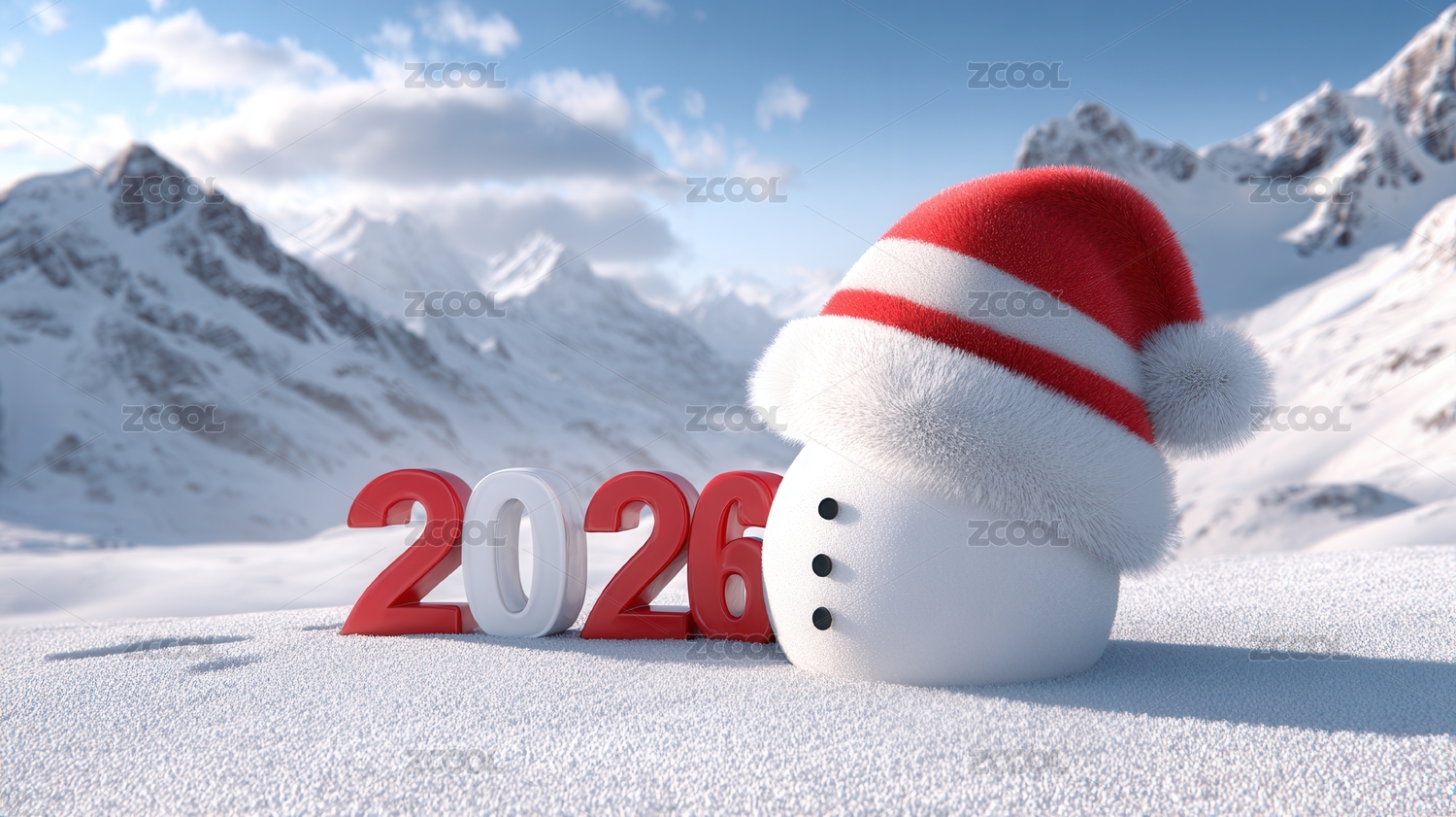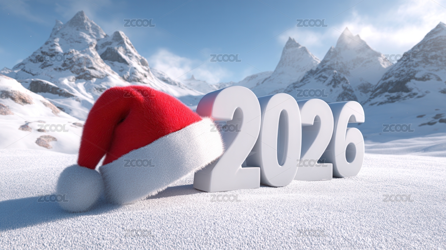 2026年带圣诞帽的雪山新年景象