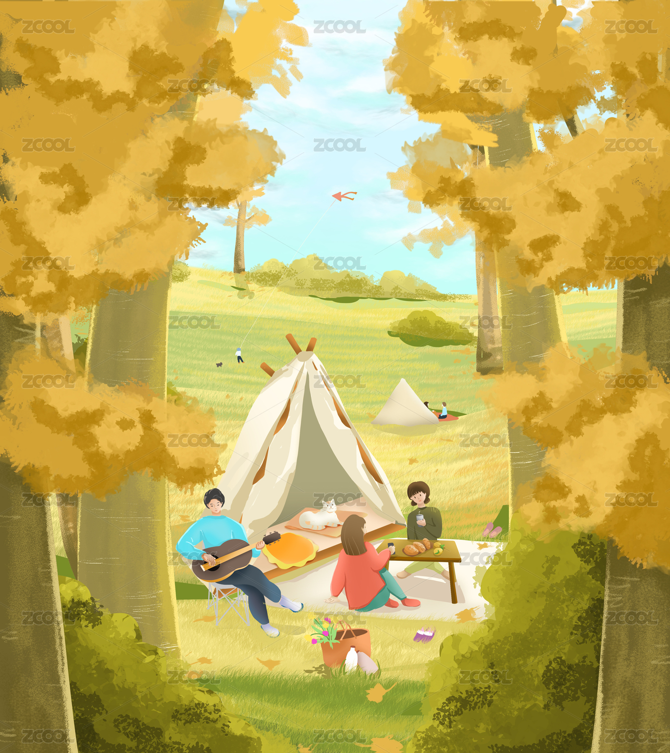 秋天户外露营帐篷插画