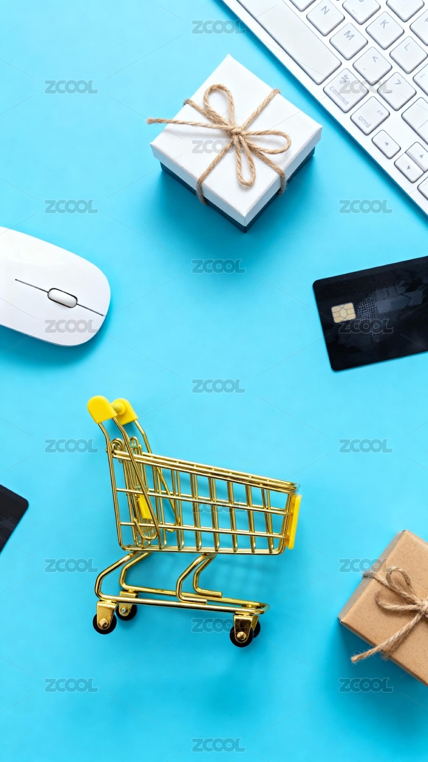 黄色背景前装着礼物的购物车模型和电脑键盘