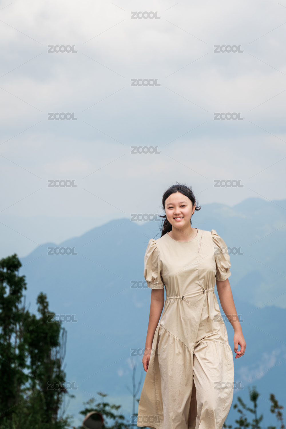 晴朗的夏天午后走在盘山公路上的东方女孩