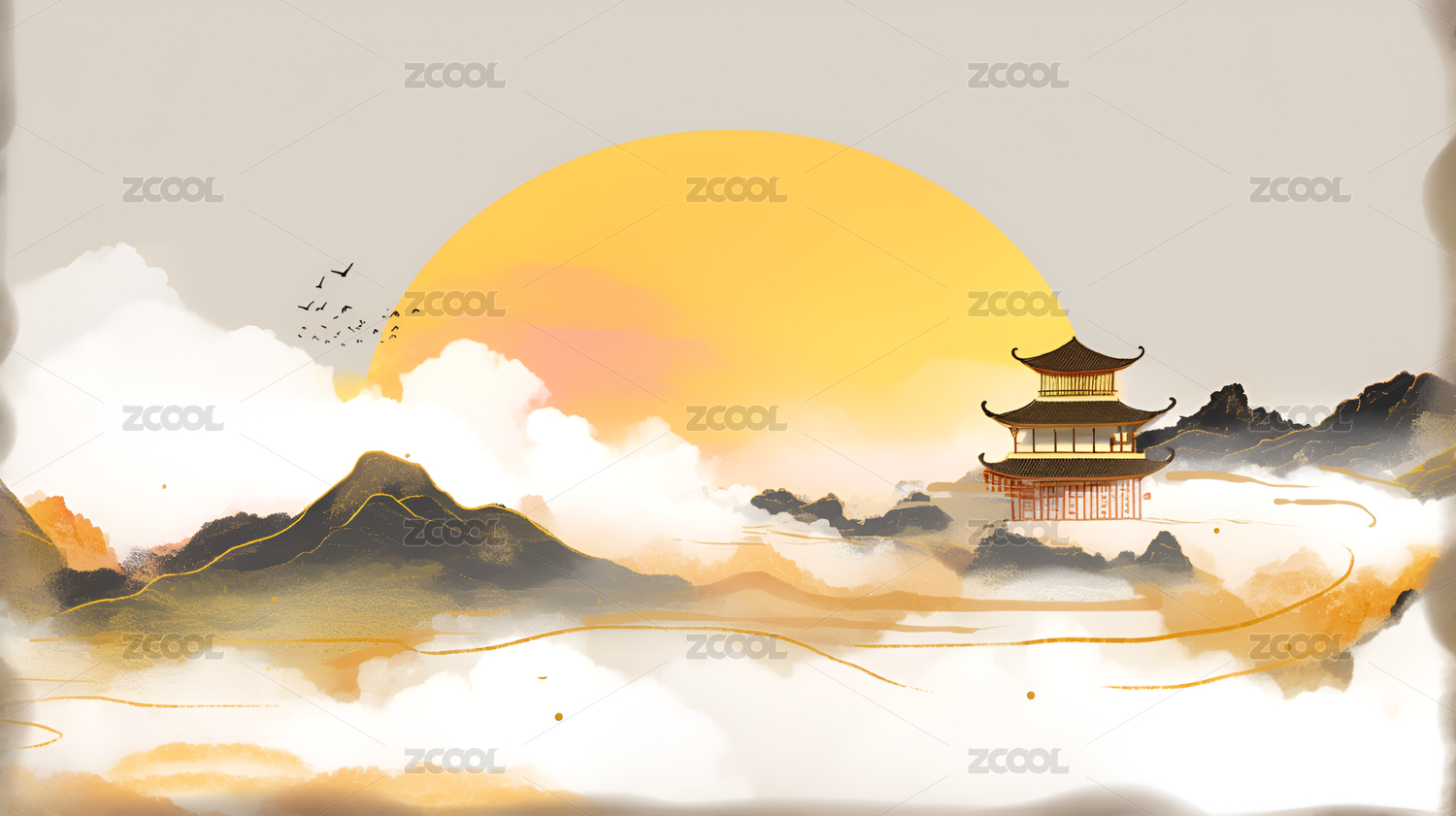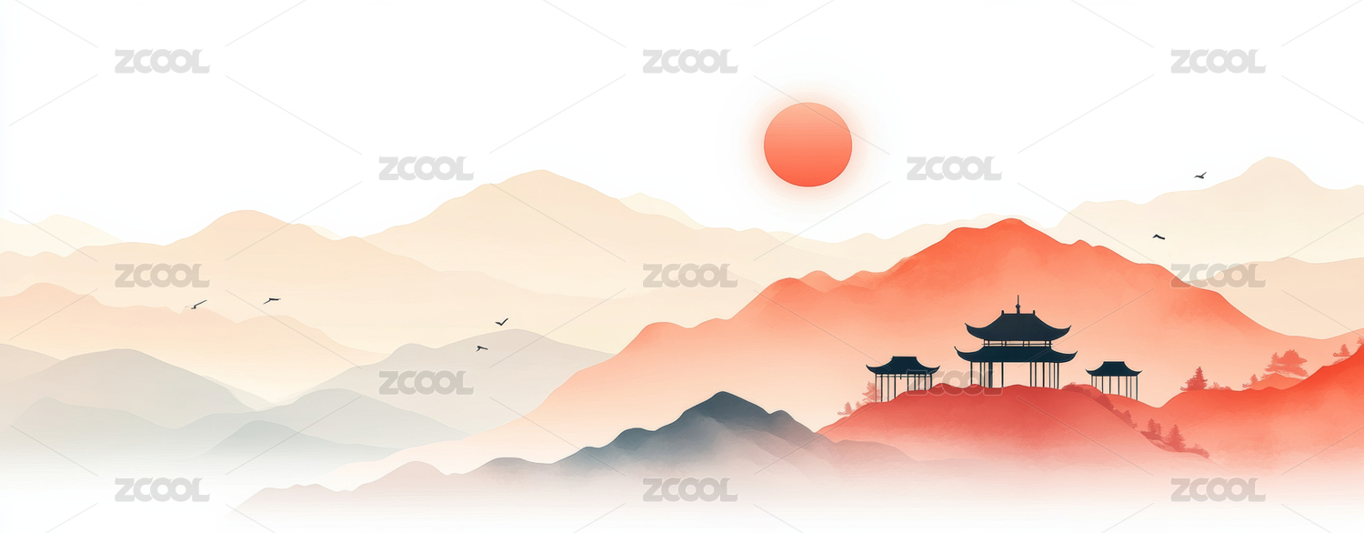 秋天,秋季,自然,风景,山,雾,塔,插画