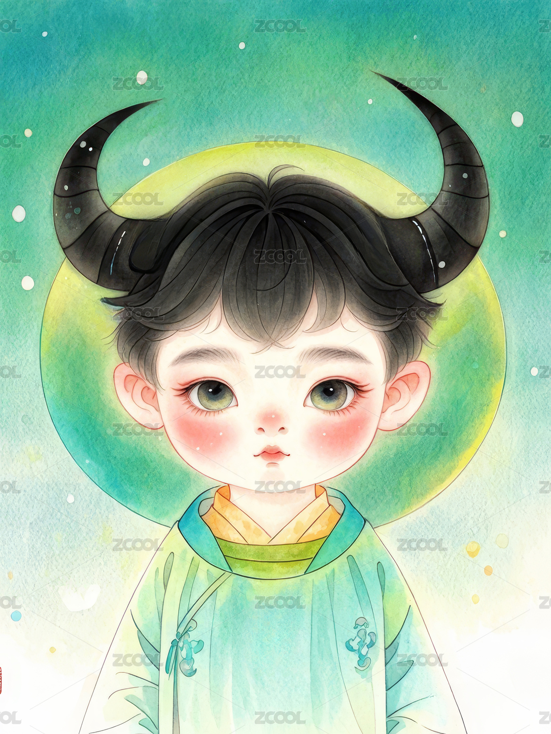 十二星座,国风,水墨,卡通,插画,男孩,金牛座