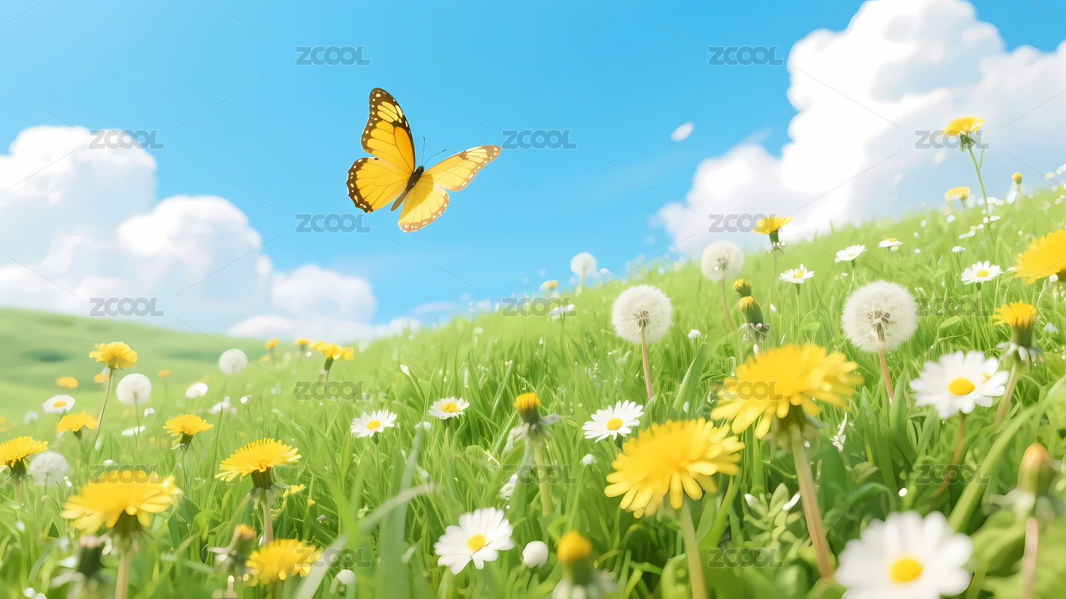 草地蝴蝶与蒲公英花朵