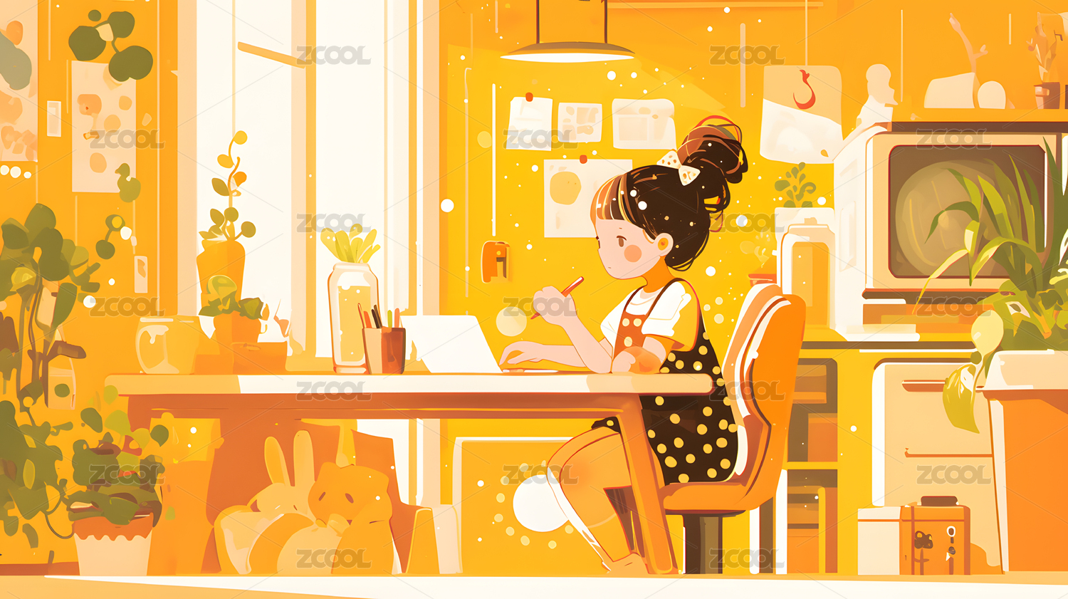 卡通可爱女生居家电脑学习办公插画