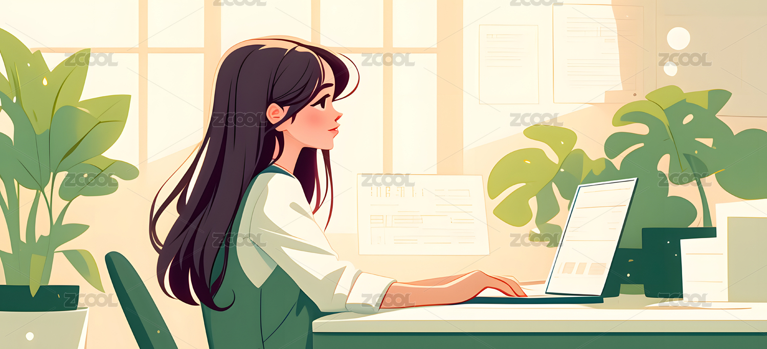 超现实唯美风格女孩在办公室电脑前办公插画