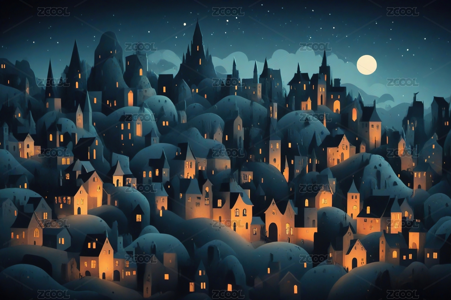 万圣节恐怖房屋夜晚城堡复古装饰节日插画