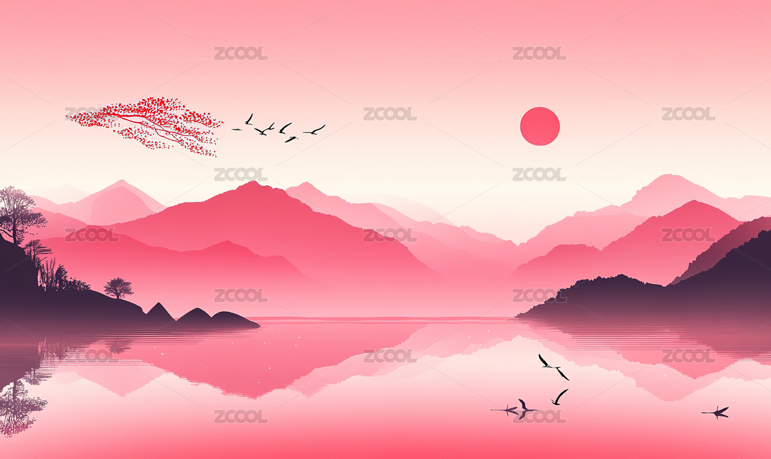 日落山峦湖泊倒影飞鸟