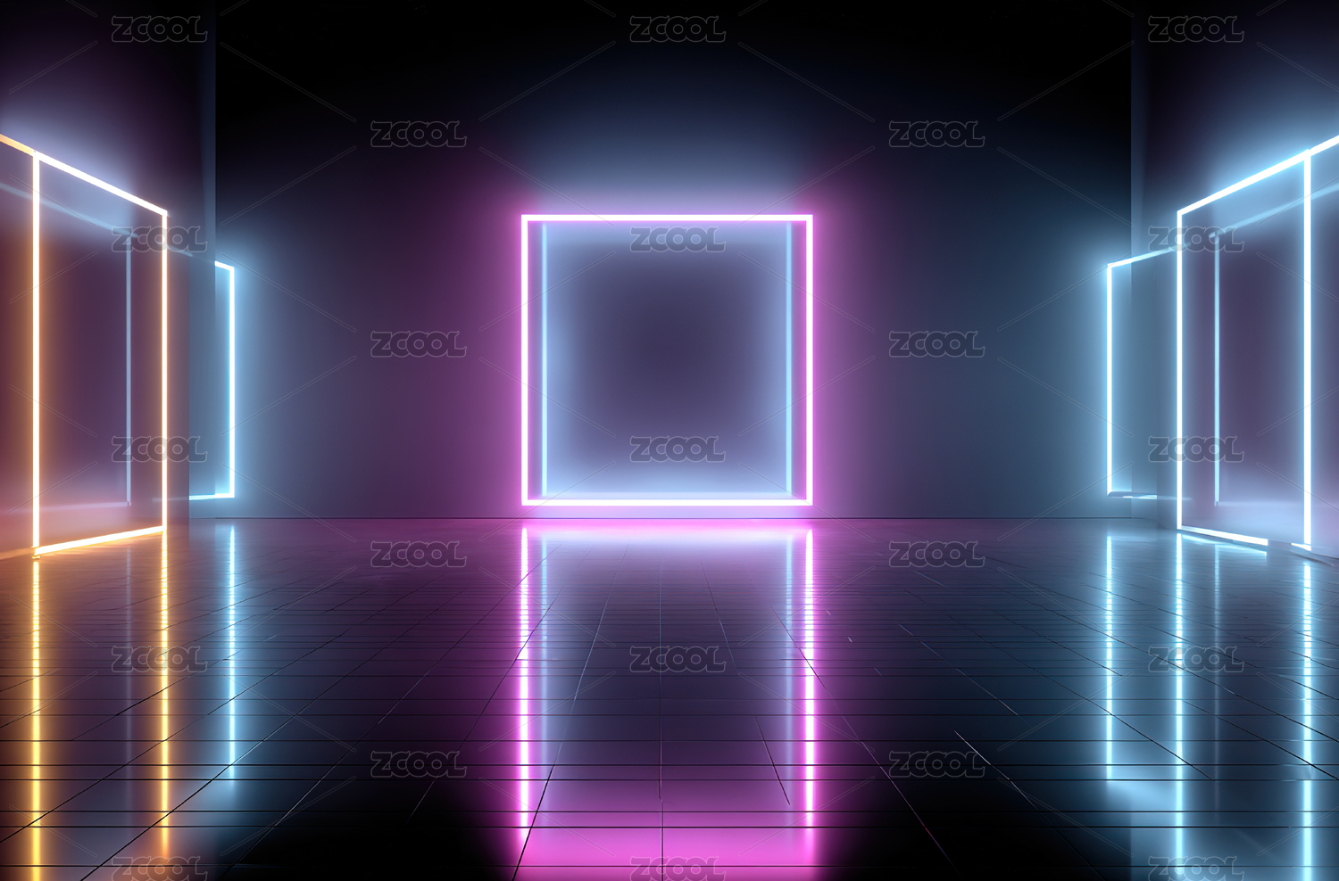 未来派科幻抽象蓝色和紫色霓虹灯形状在黑色背景和反光混凝土的留白空间,3D渲染图