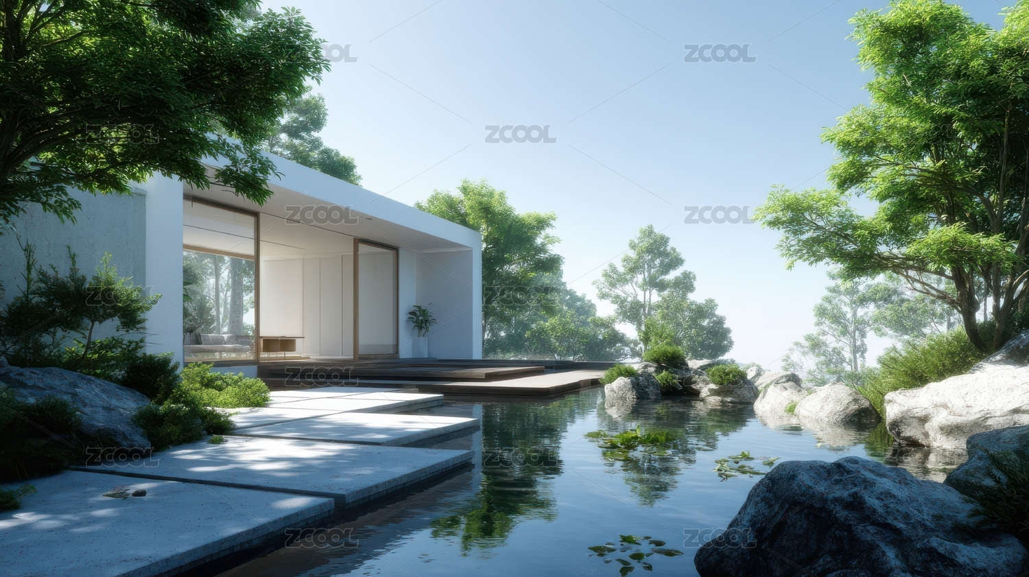 现代别墅与锦鲤池