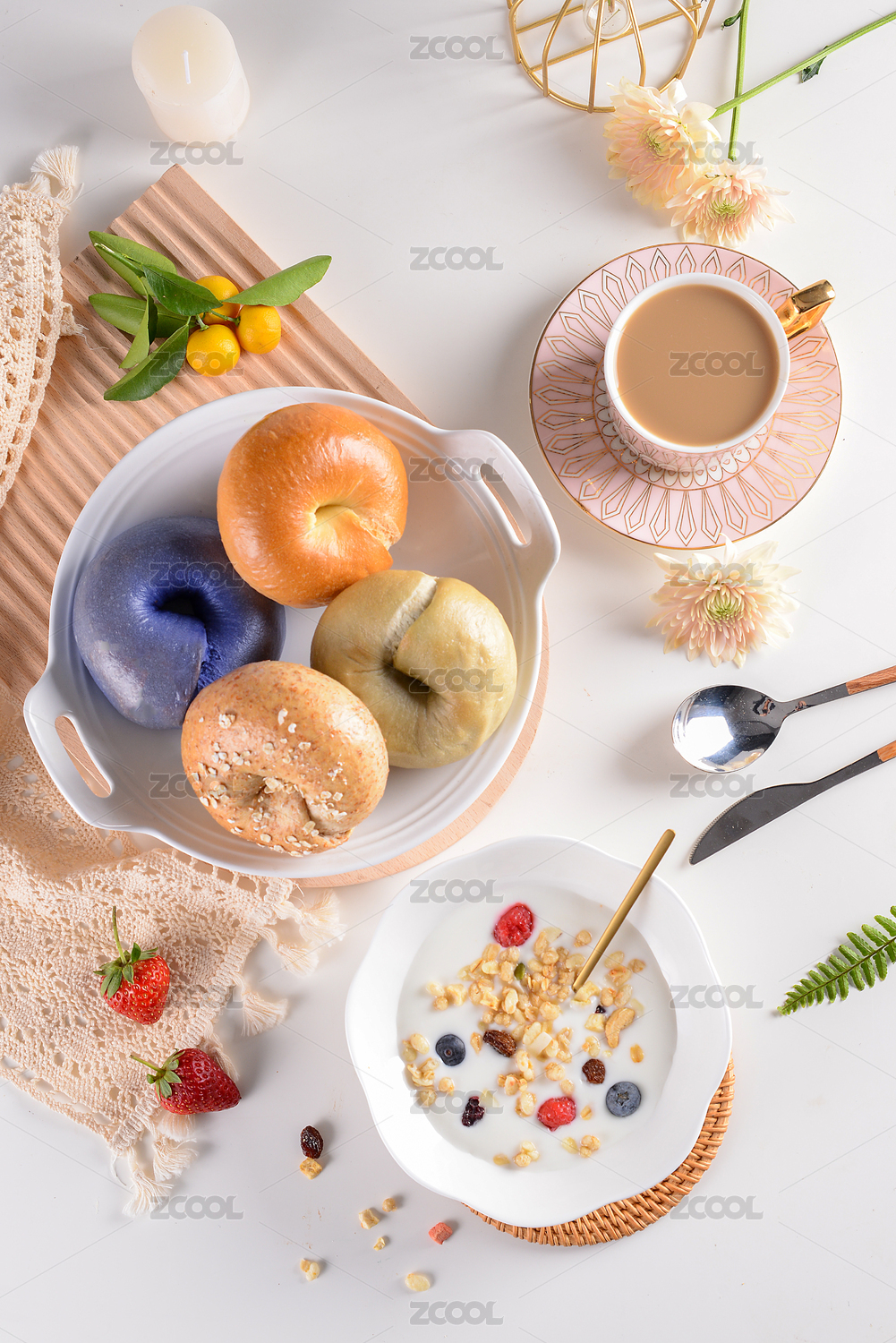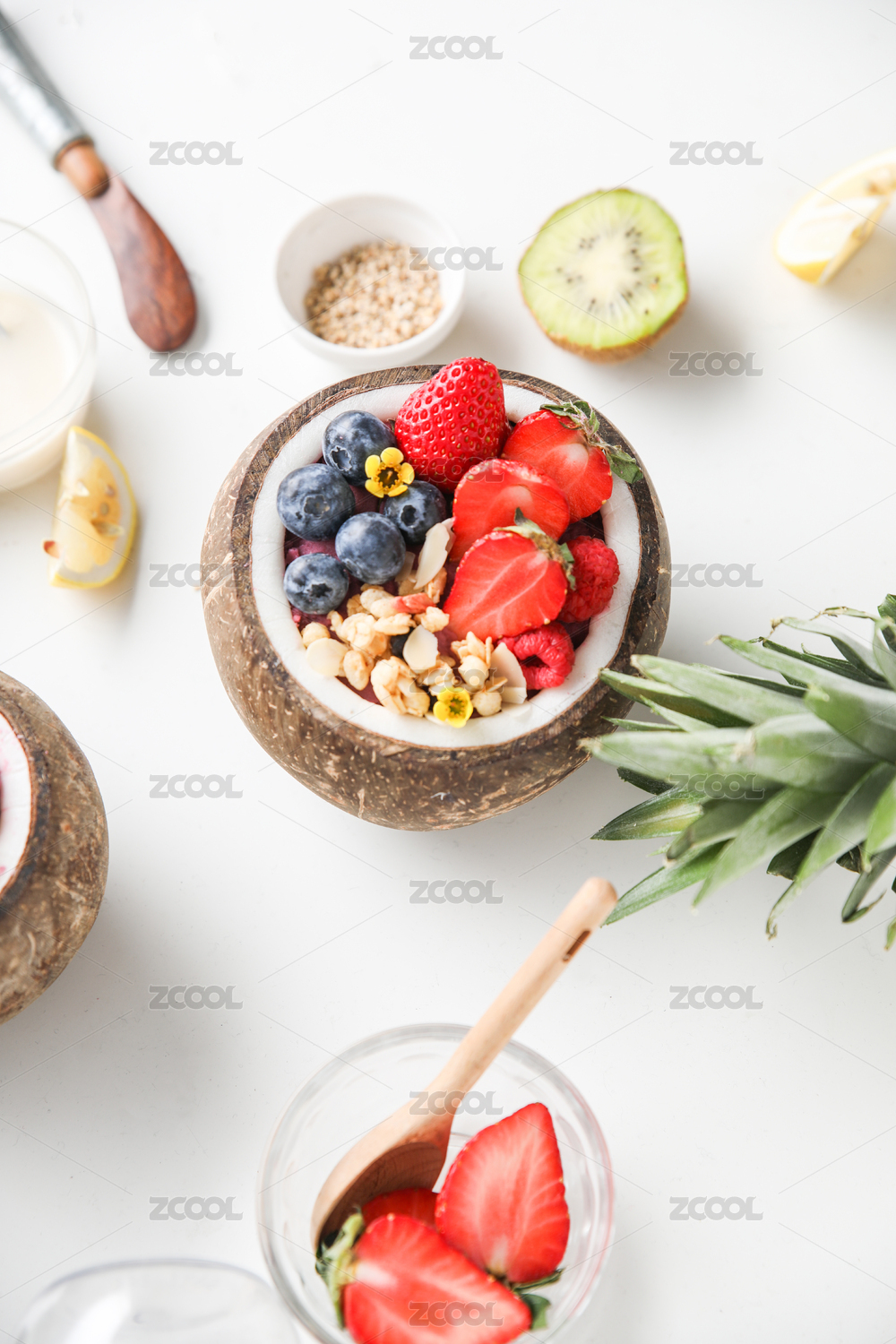 俯拍椰子装着草莓蓝莓水果酸奶沙拉
