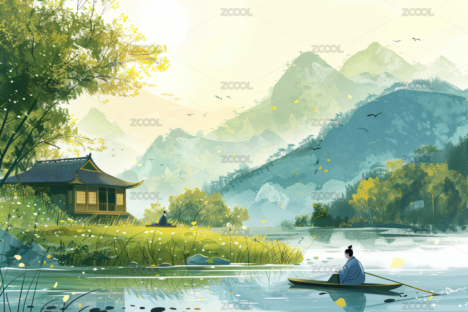 夏天池塘荷花植物绿色建筑清新扁平插画