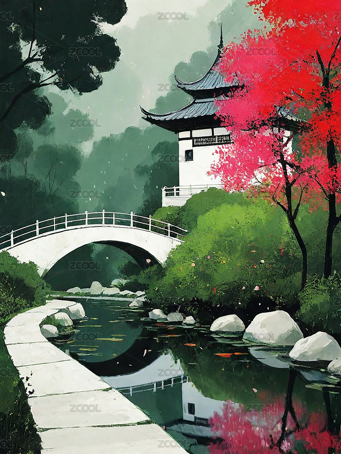 像素风,像素艺术,荷塘,庭院,中式庭院,日本,锦鲤,池塘,唯美