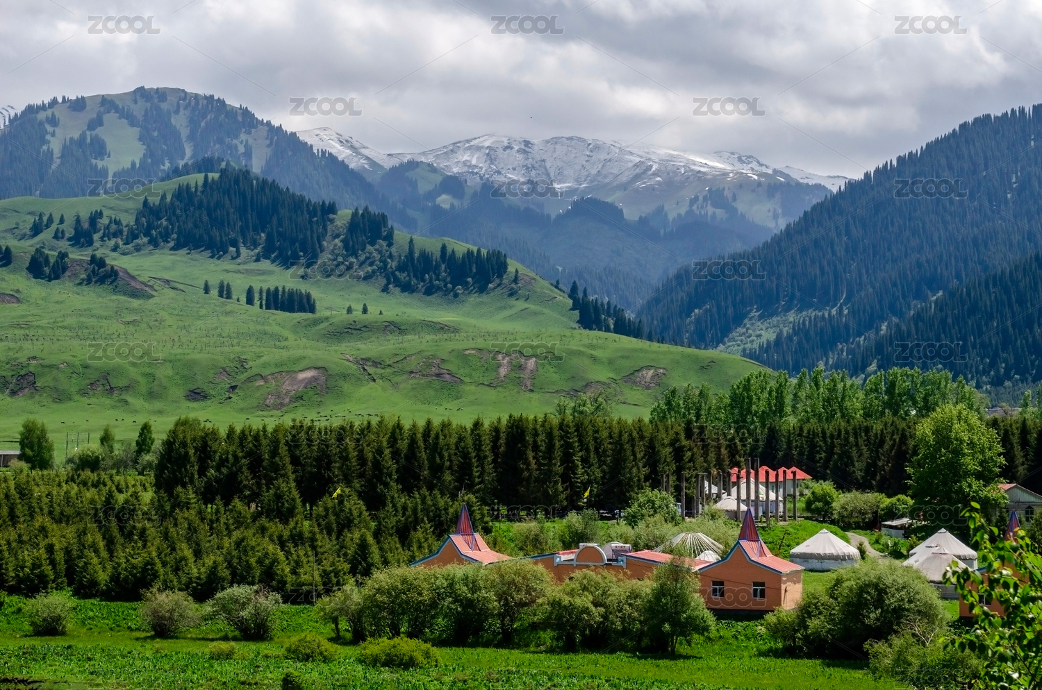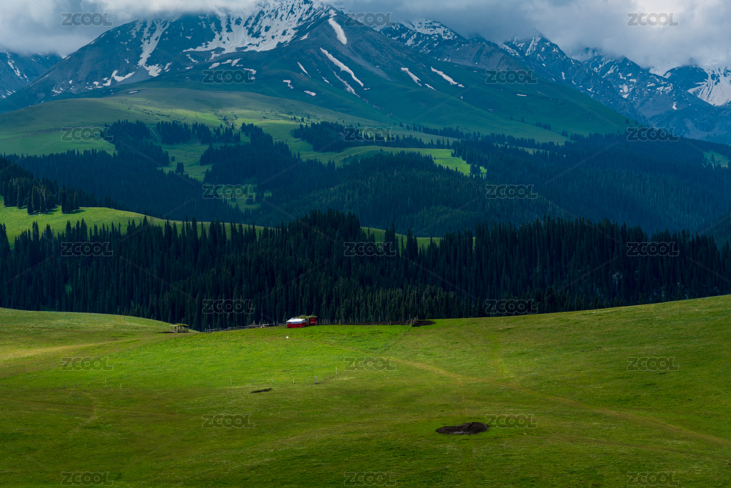 中国新疆伊犁那拉提雪山下草原上的小木屋