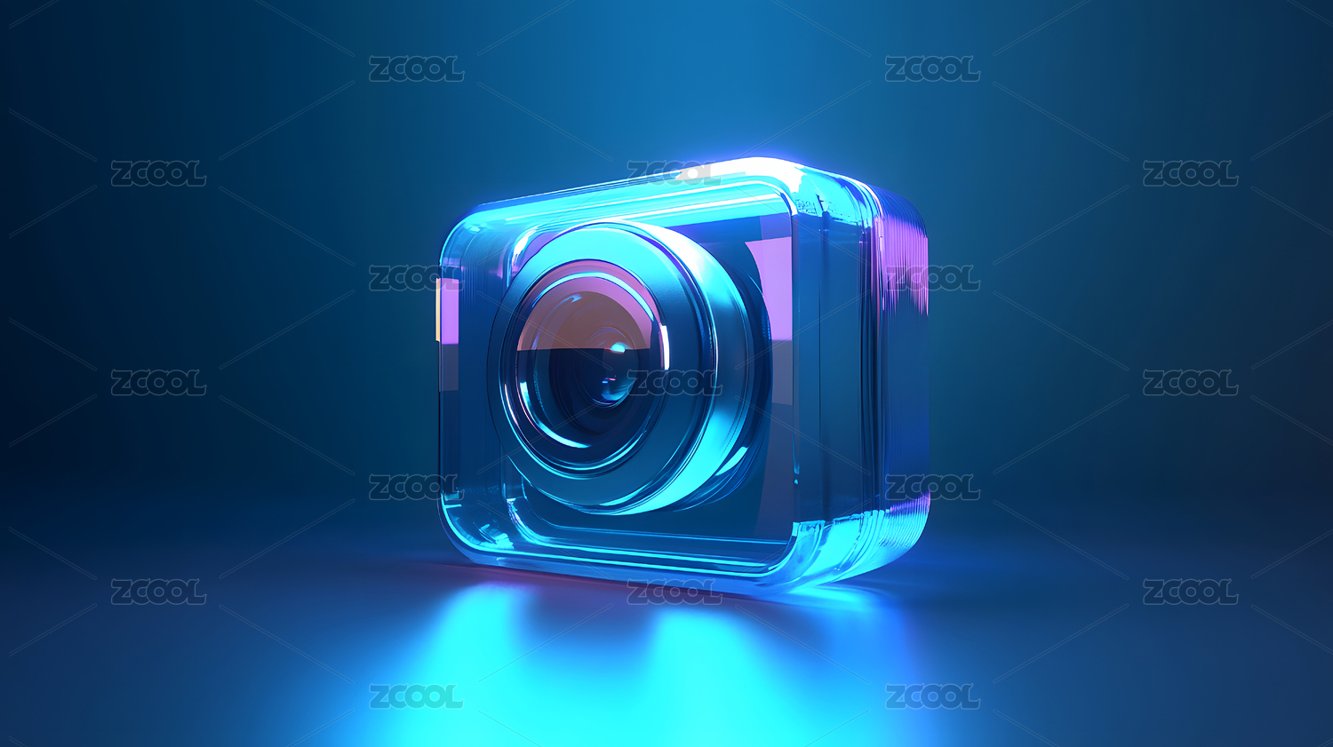 白色背景下的蓝色磨砂玻璃质感的透明照相机