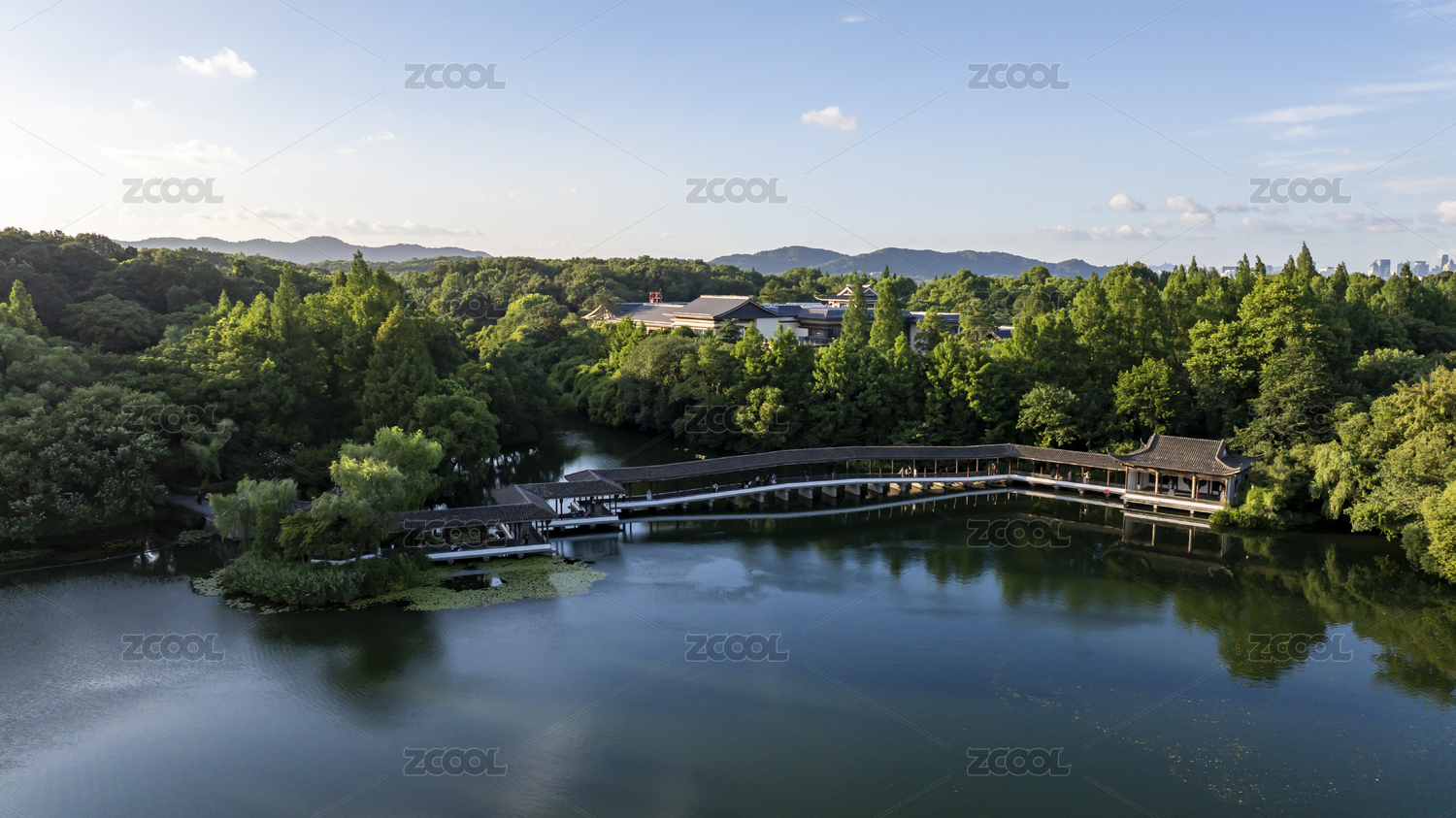 航拍杭州西湖中式园林景观全景