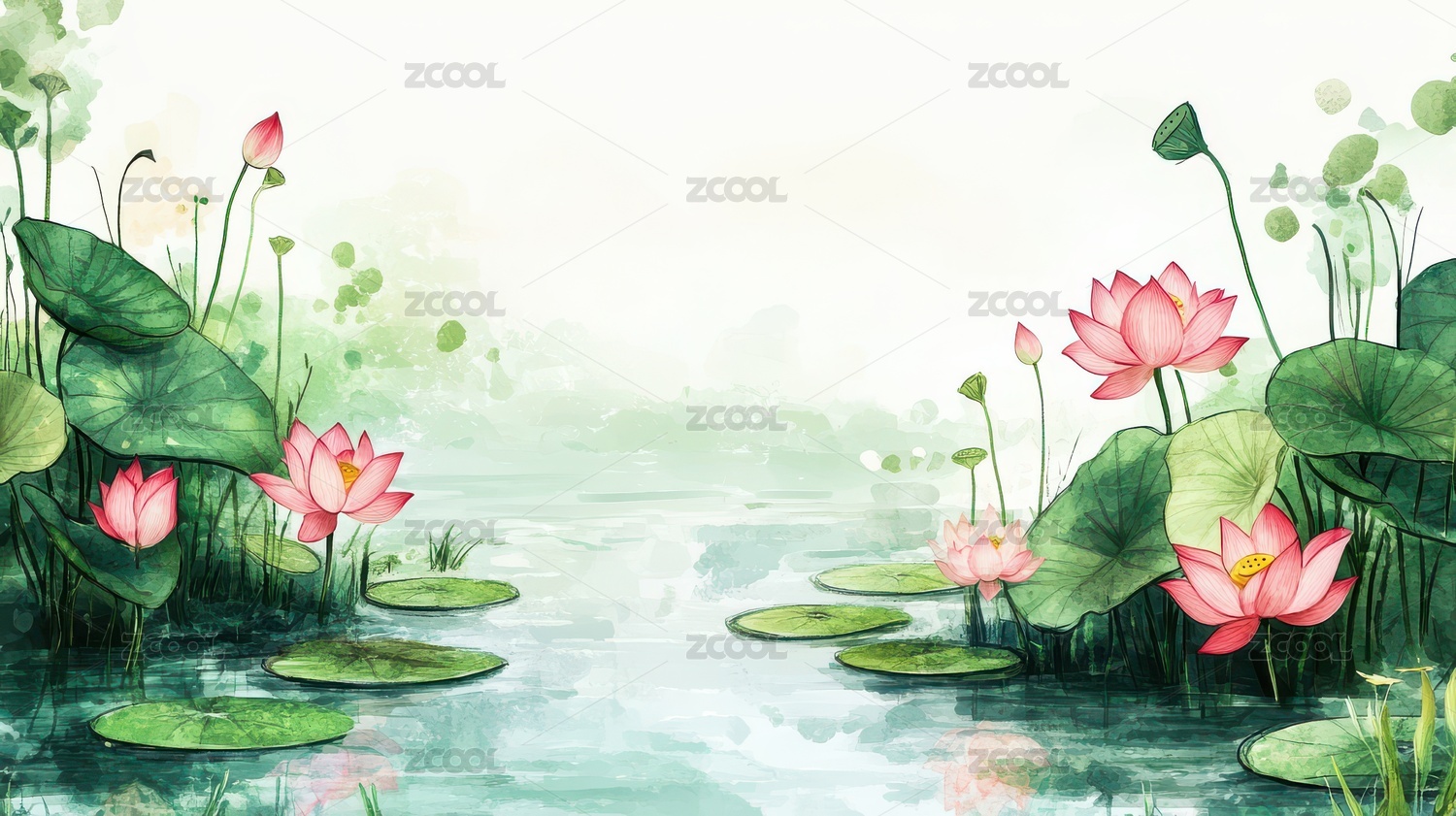 清新夏天节气荷花荷叶手绘水彩壁纸插画