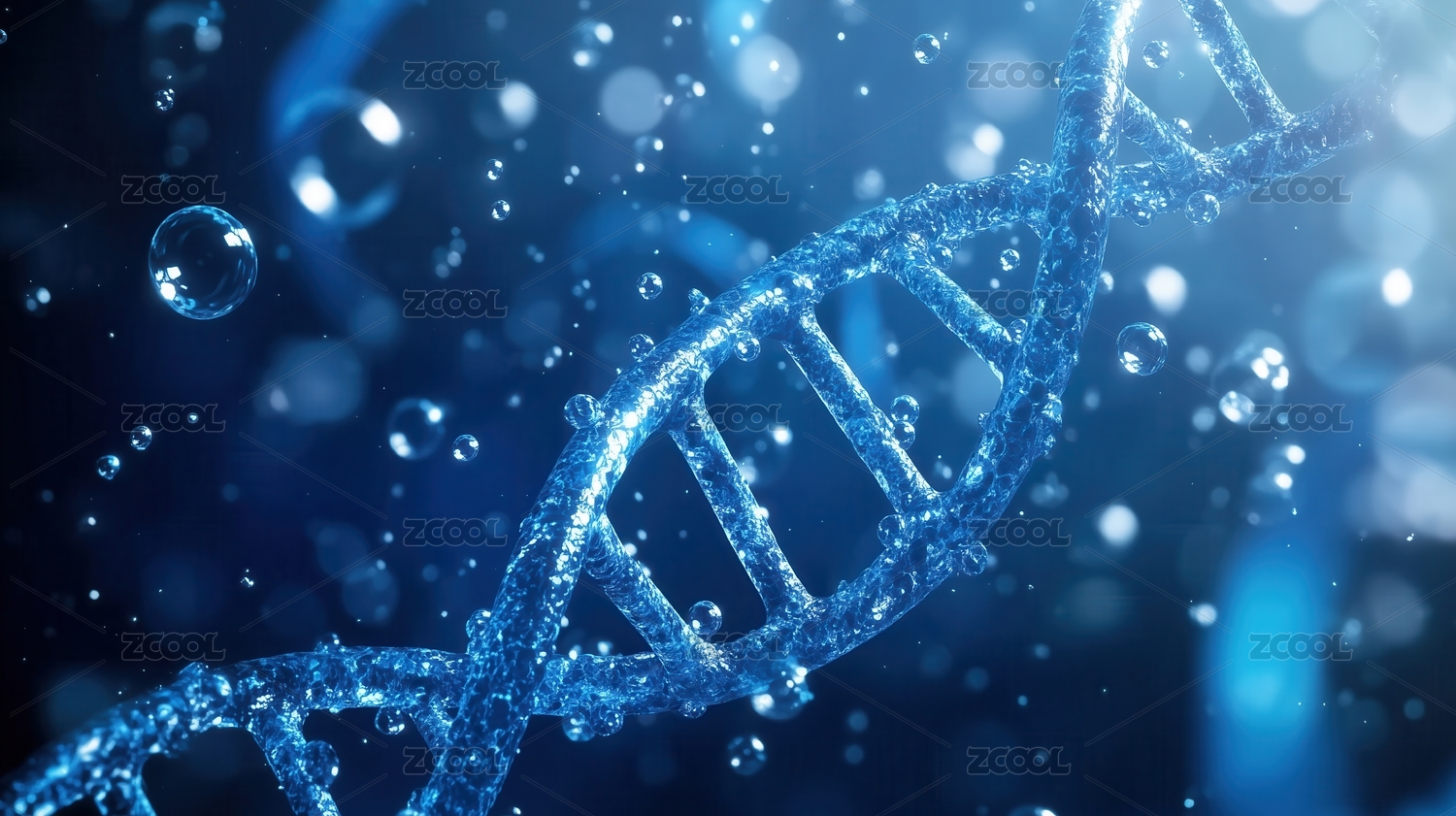 蓝色背景微观世界里的DNA 染色体螺旋结