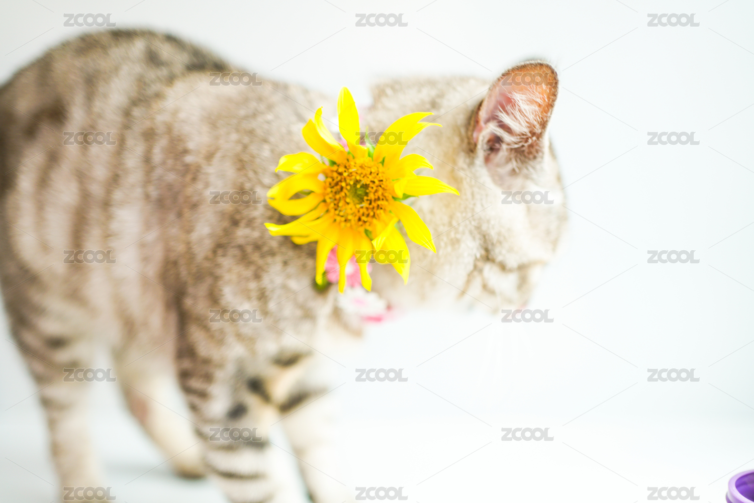 趴在白色桌子上休息的虎斑猫和黄色向日葵花