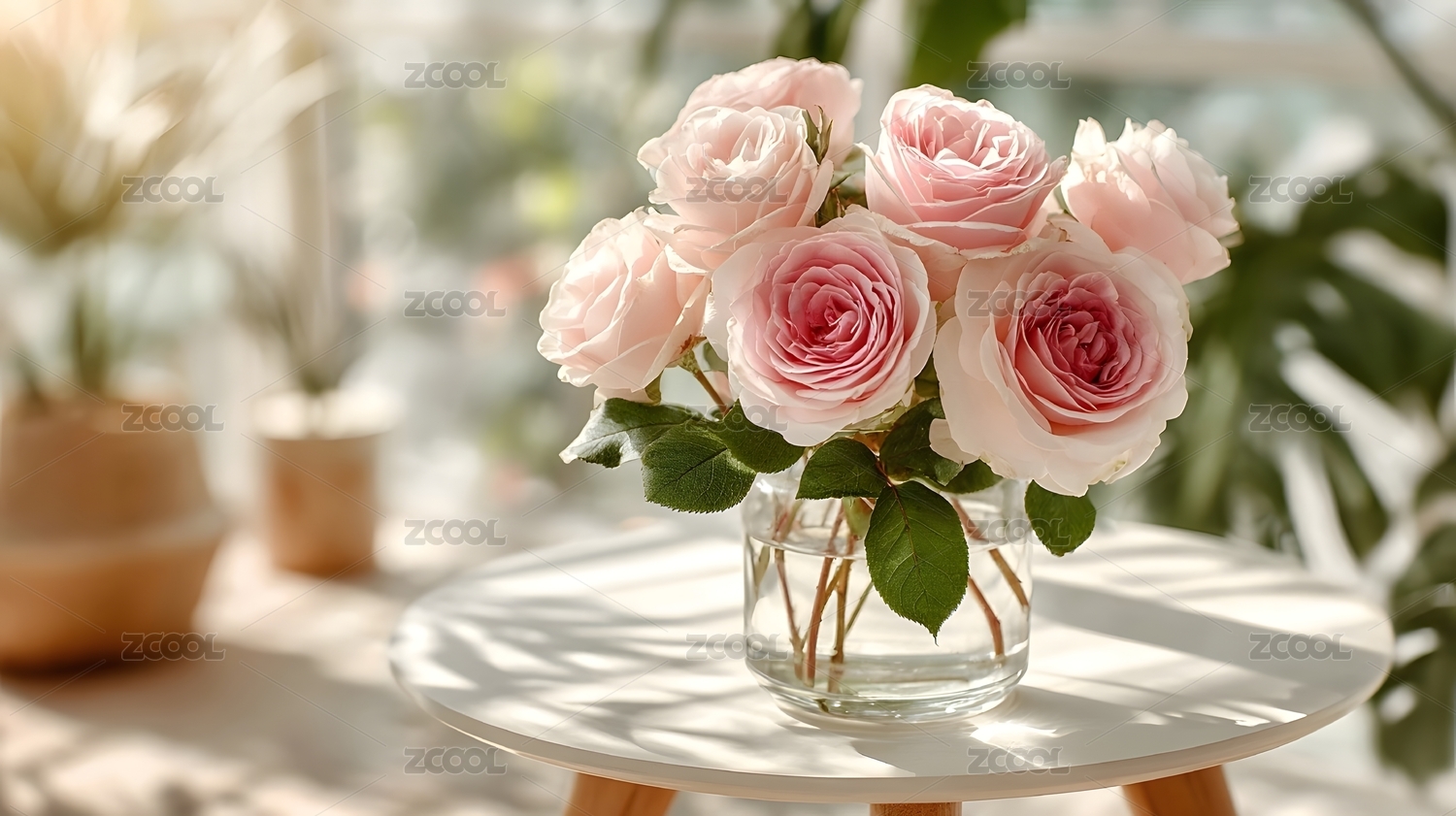 窗边粉色玫瑰花束柔和光线
