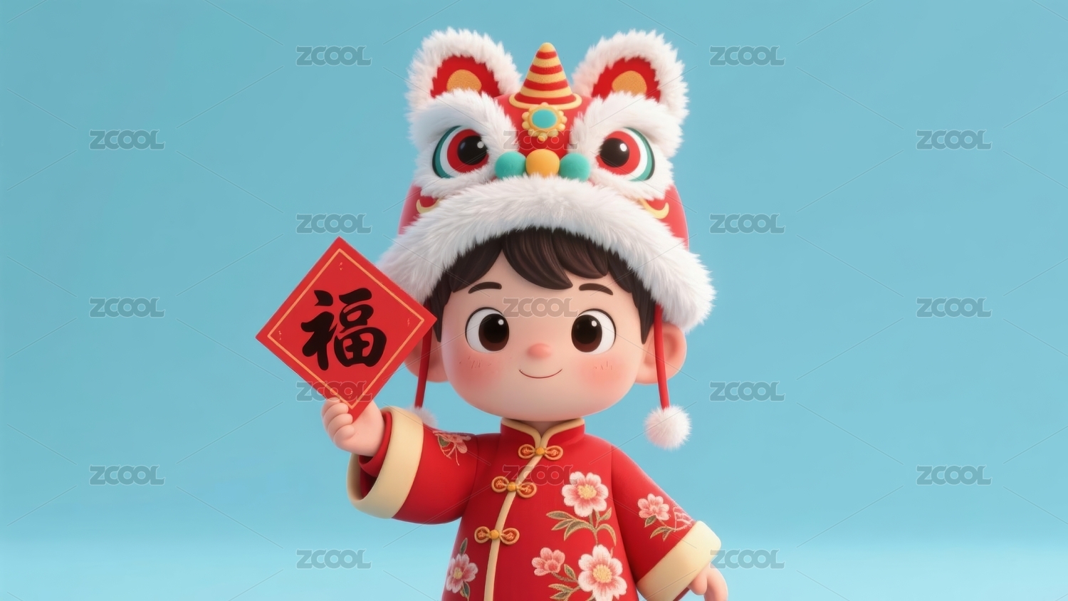 新年3D男孩开心地戴着舞狮儿子头