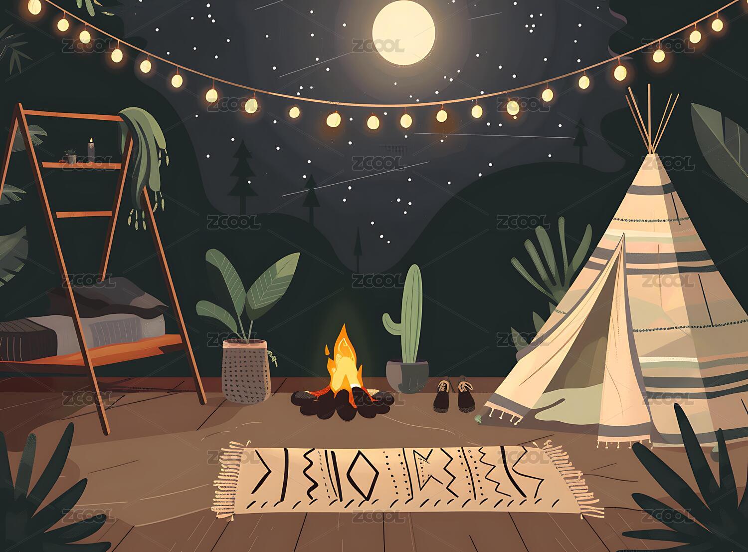 夜晚露营帐篷篝火插画