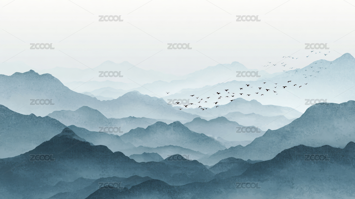 群鸟飞过层叠山峦