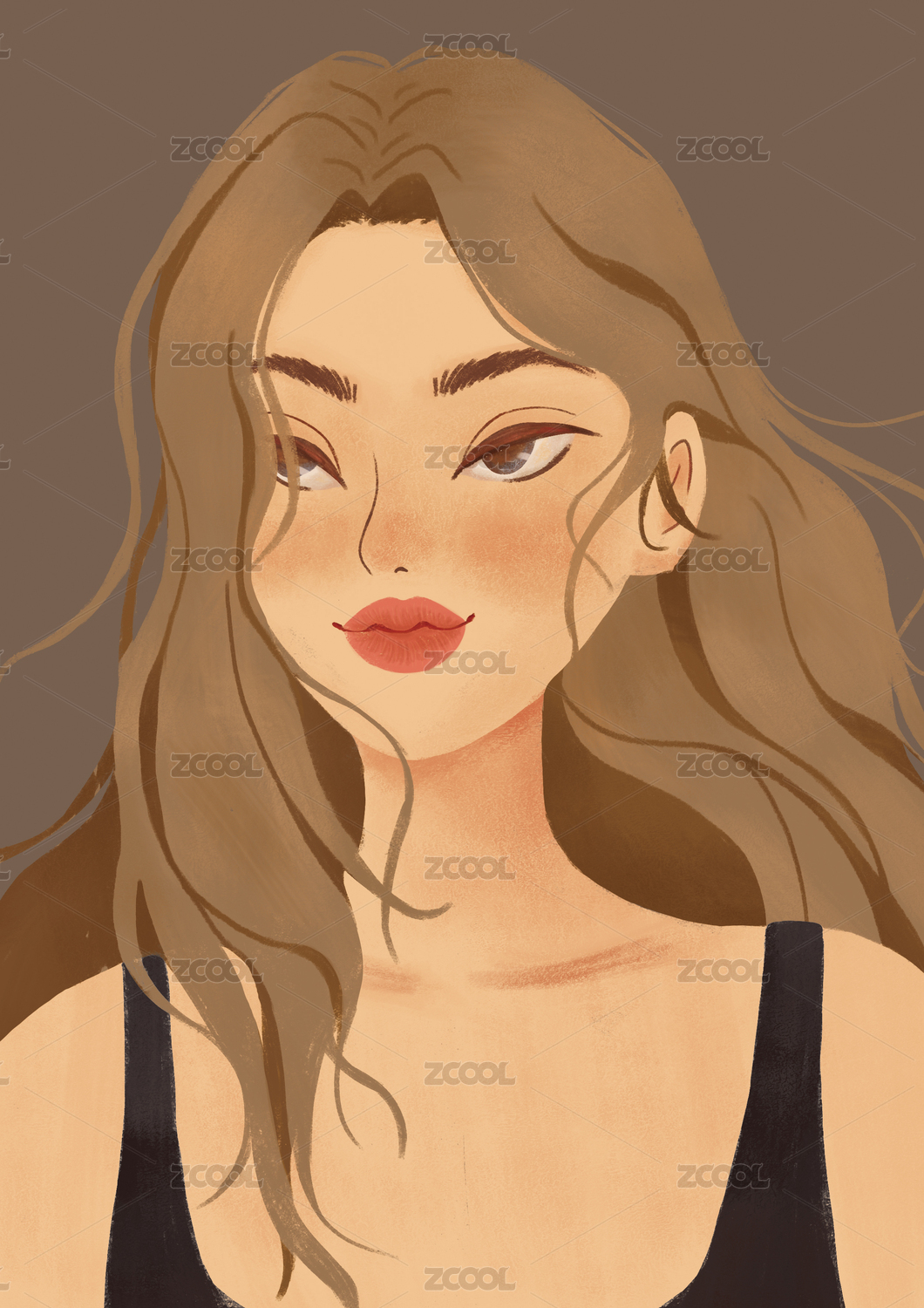 卡通小熊贴纸棕色卷发蓝色卫衣少女插画