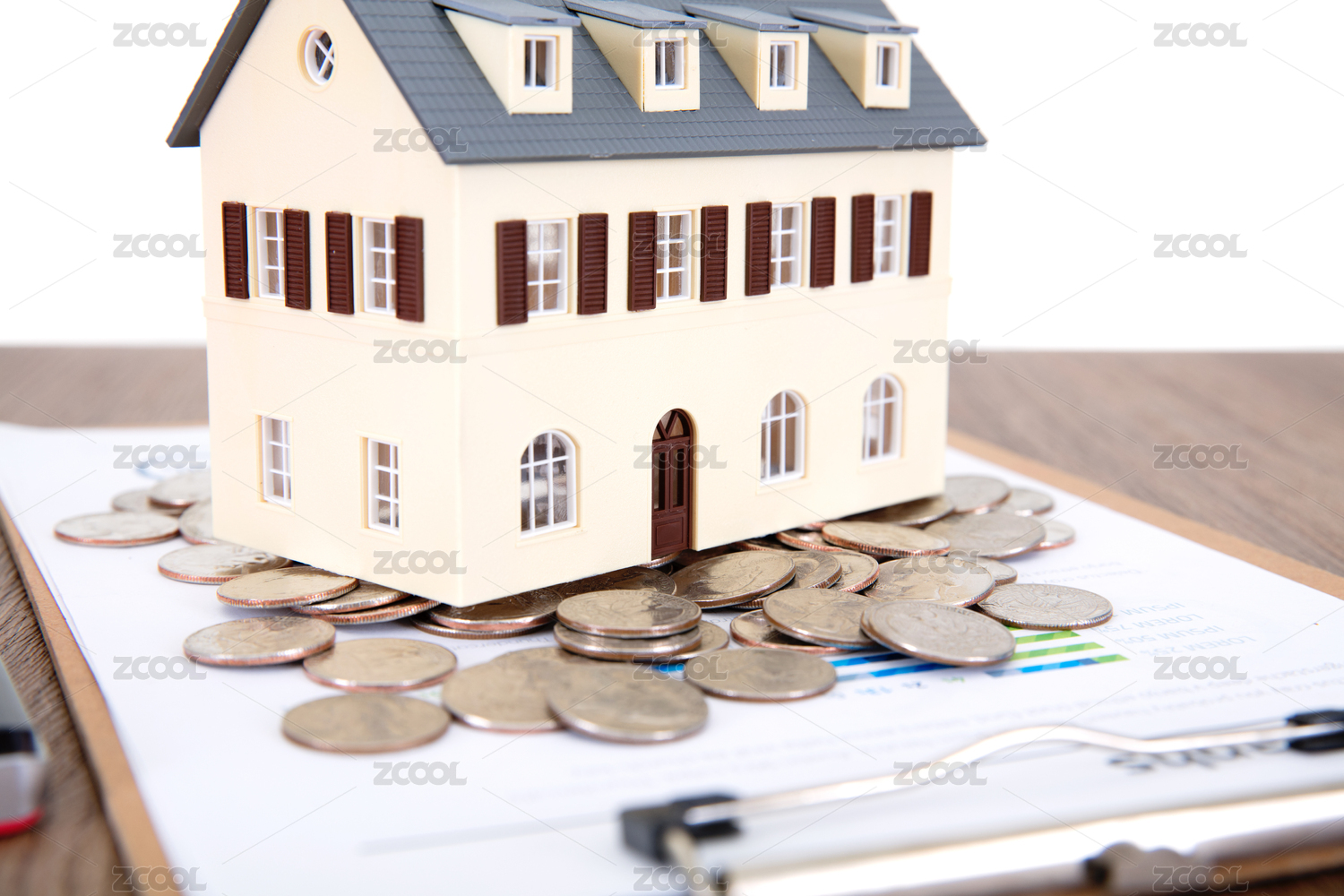 文件资料上散落的美元硬币和小房子模型