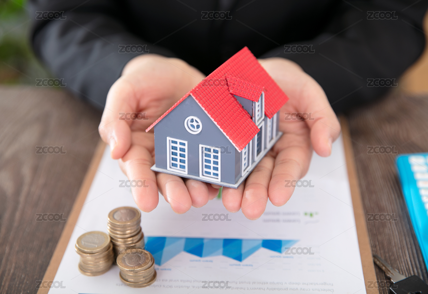 房地产相关从业者手捧小房子模型和相关文件与硬币