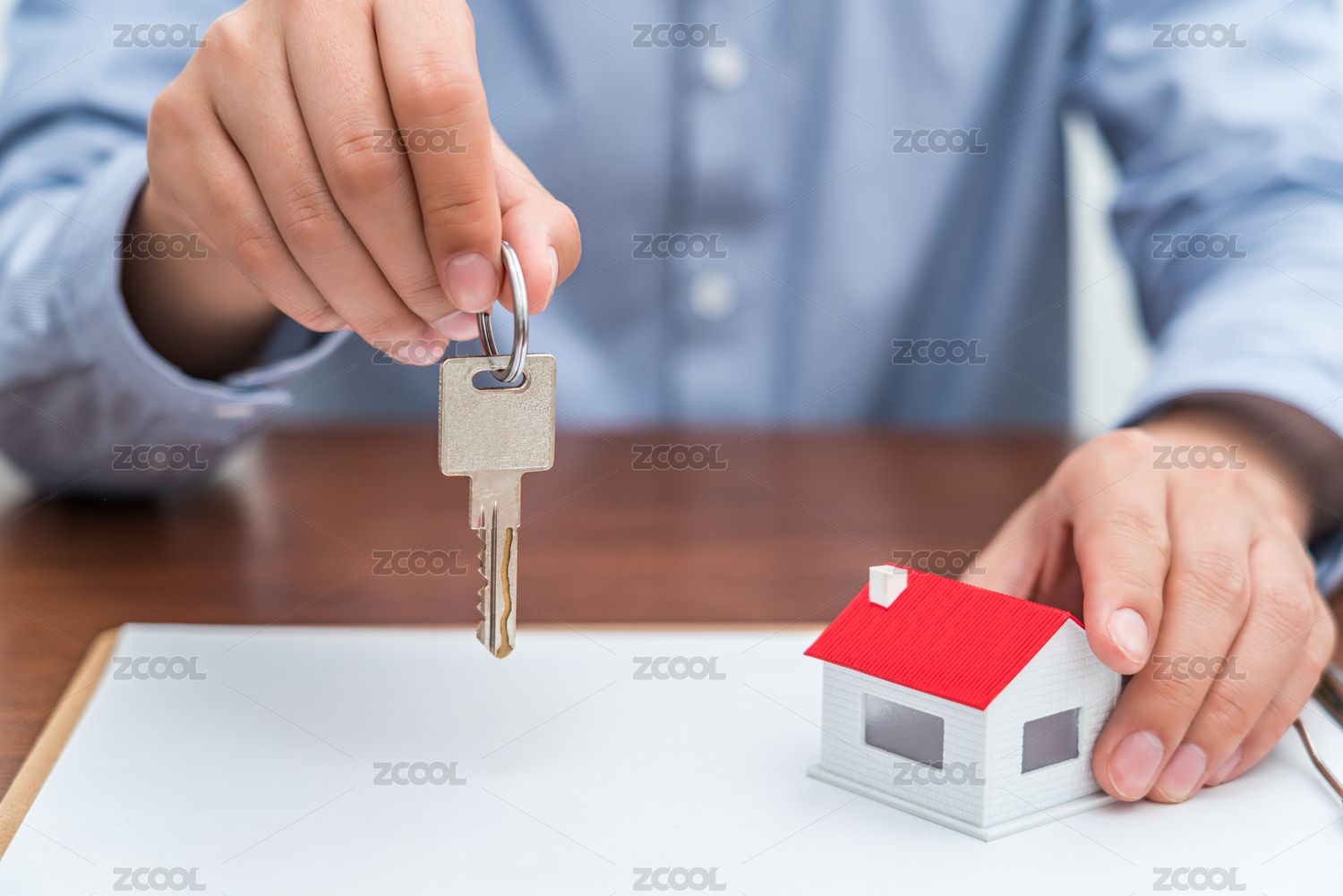 房地产销售人员手拿钥匙在放有小房子模型的文件上分析行情