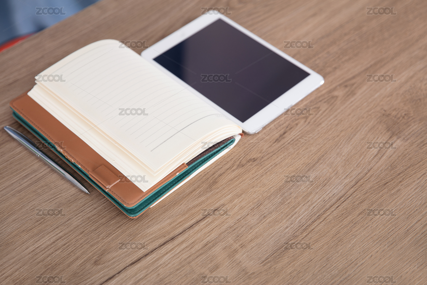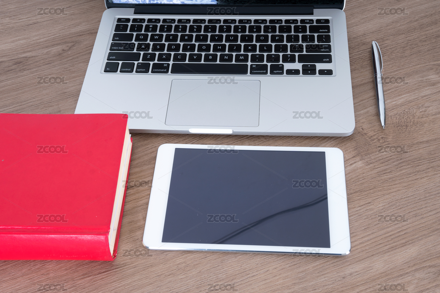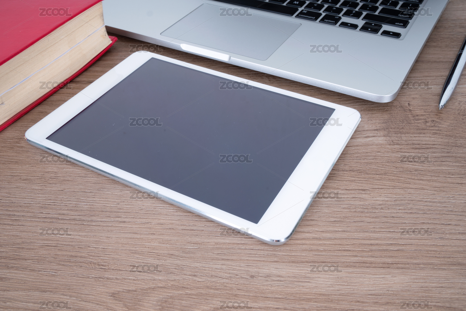 桌子上摆放整齐的笔记本电脑和平板电脑等办公用品