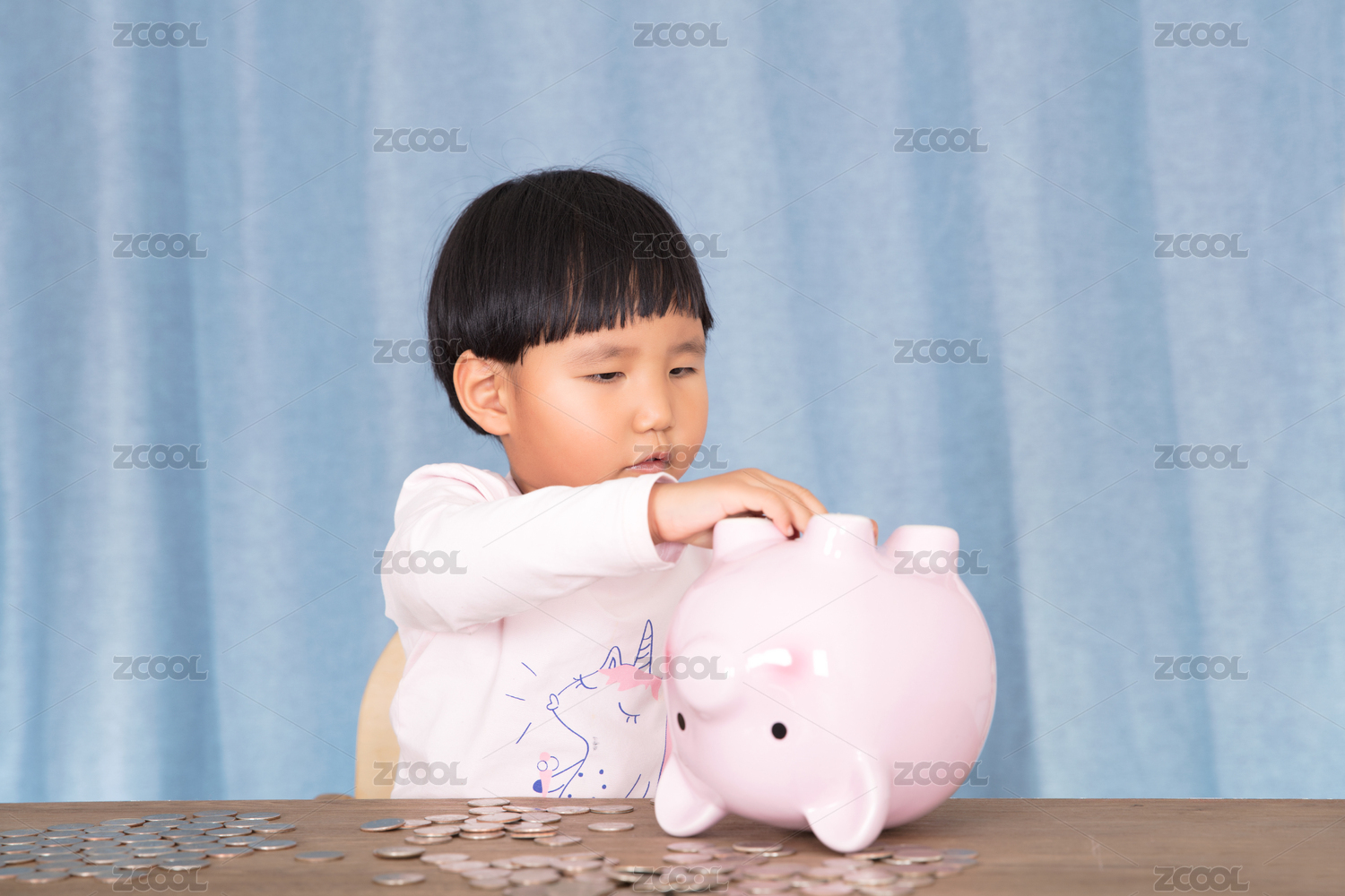 小女孩手拿硬币放入小猪存钱罐