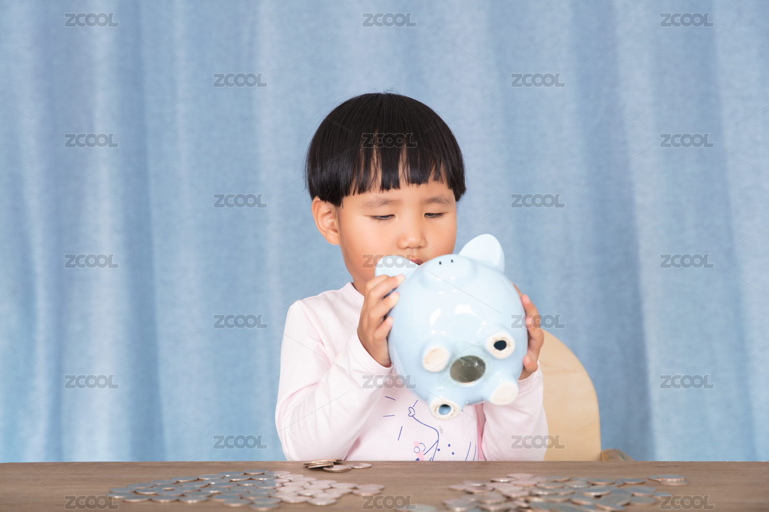 中国小孩子在翻腾小猪存钱罐看是否还有硬币