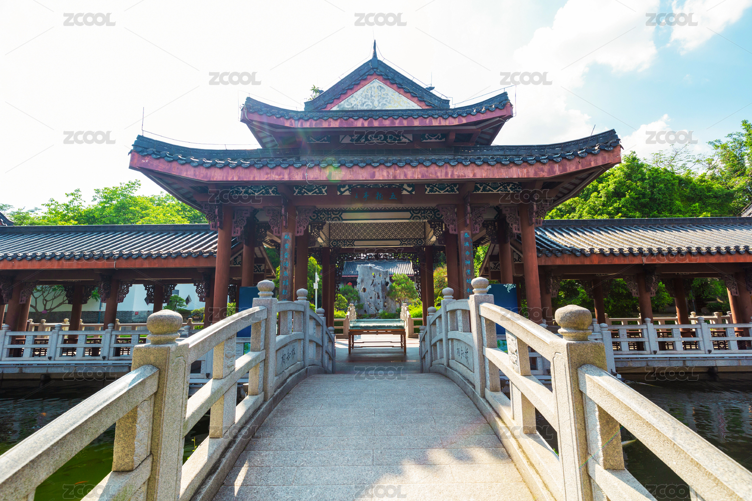 南宁狮山公园湖泊竹影桥中式传统亭台楼阁