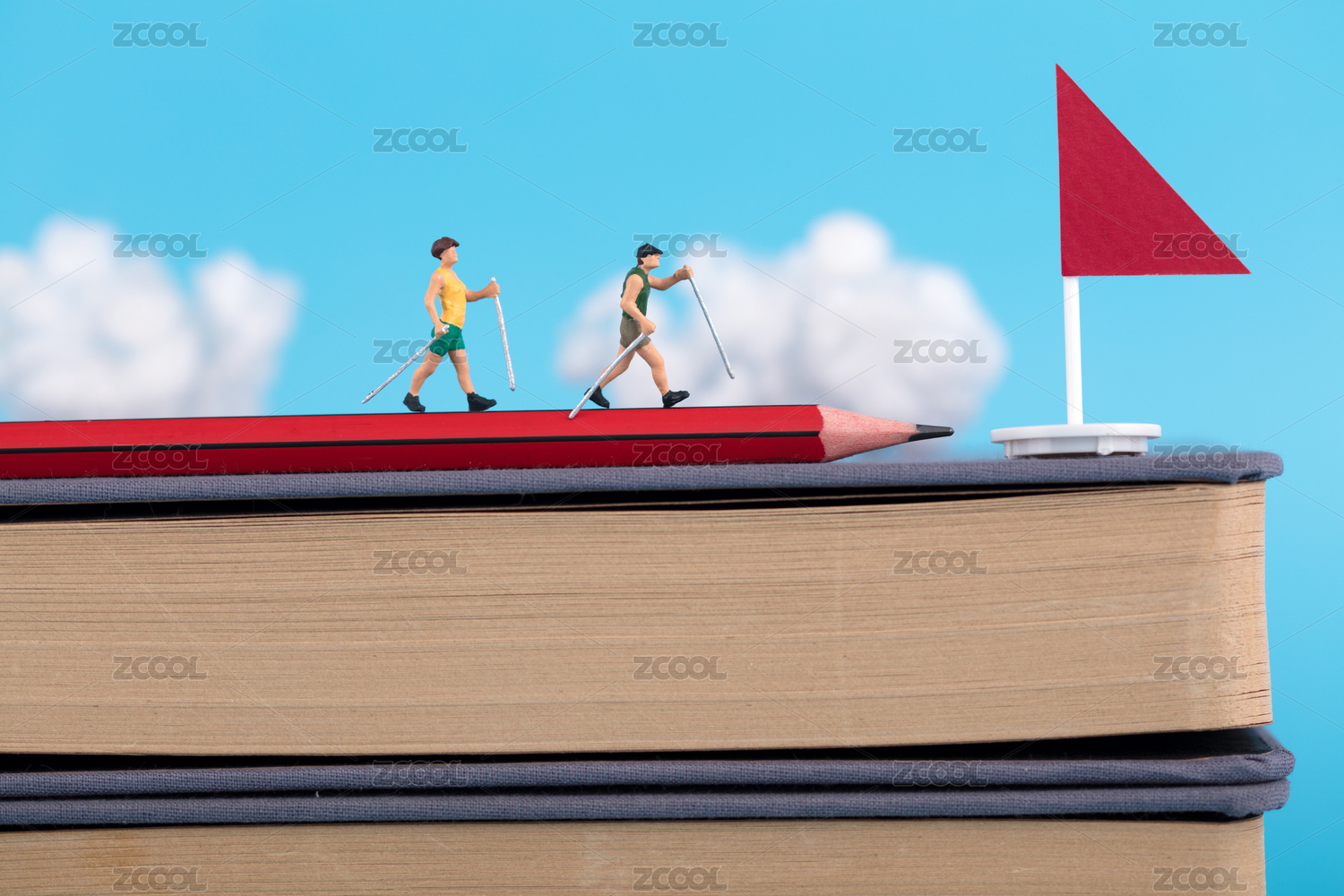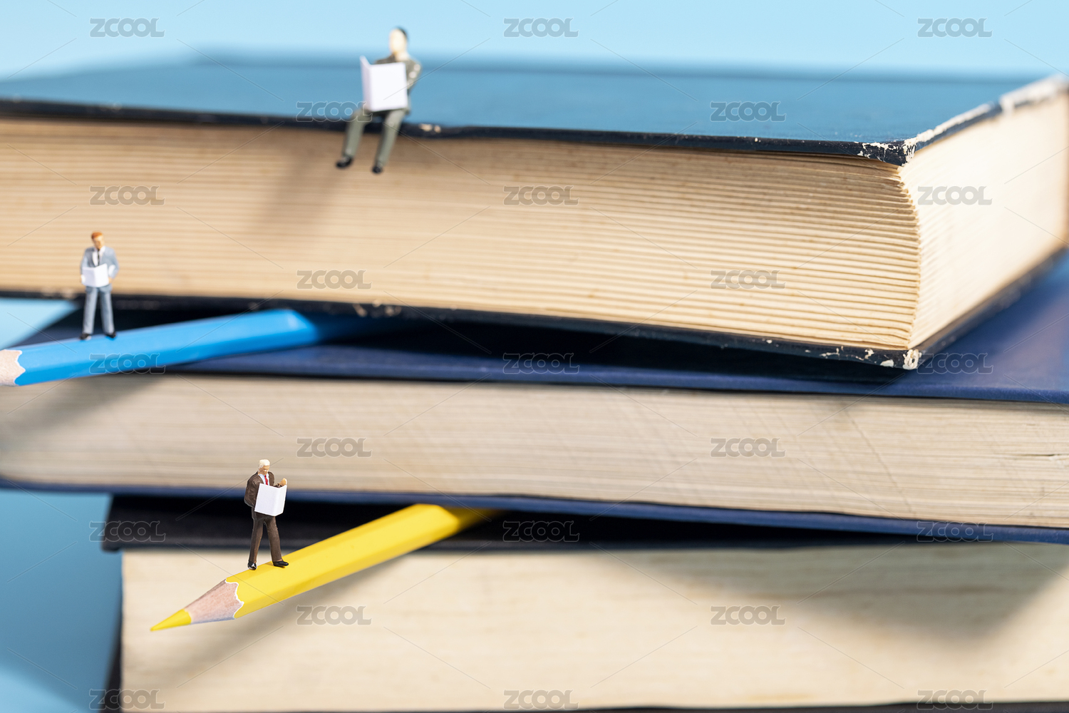 骑车的微缩模型通过彩铅笔到达书本顶端