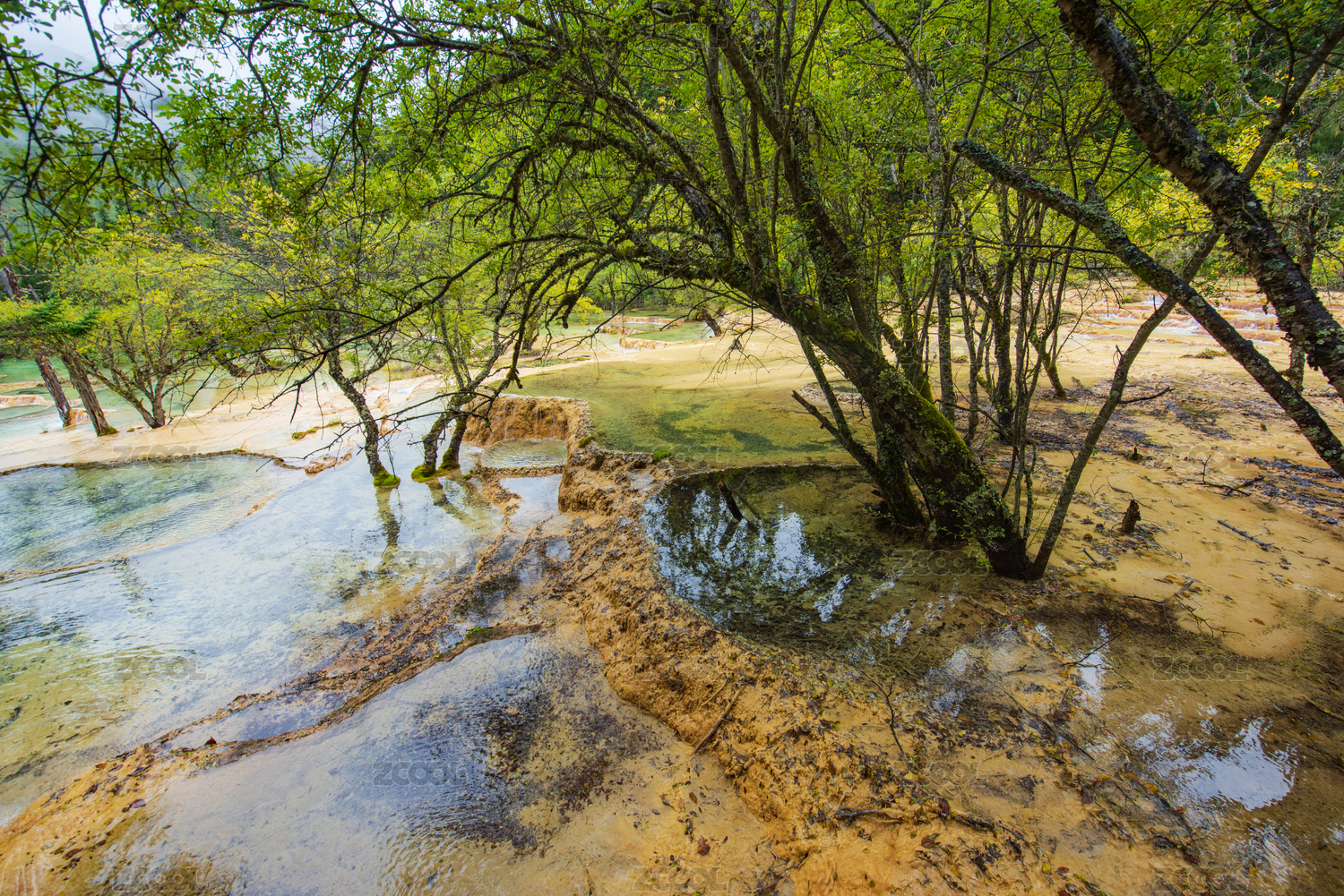 四川,黄龙,雨天,靛蓝,树木,瑶池,五彩池,彩池,水,地质
