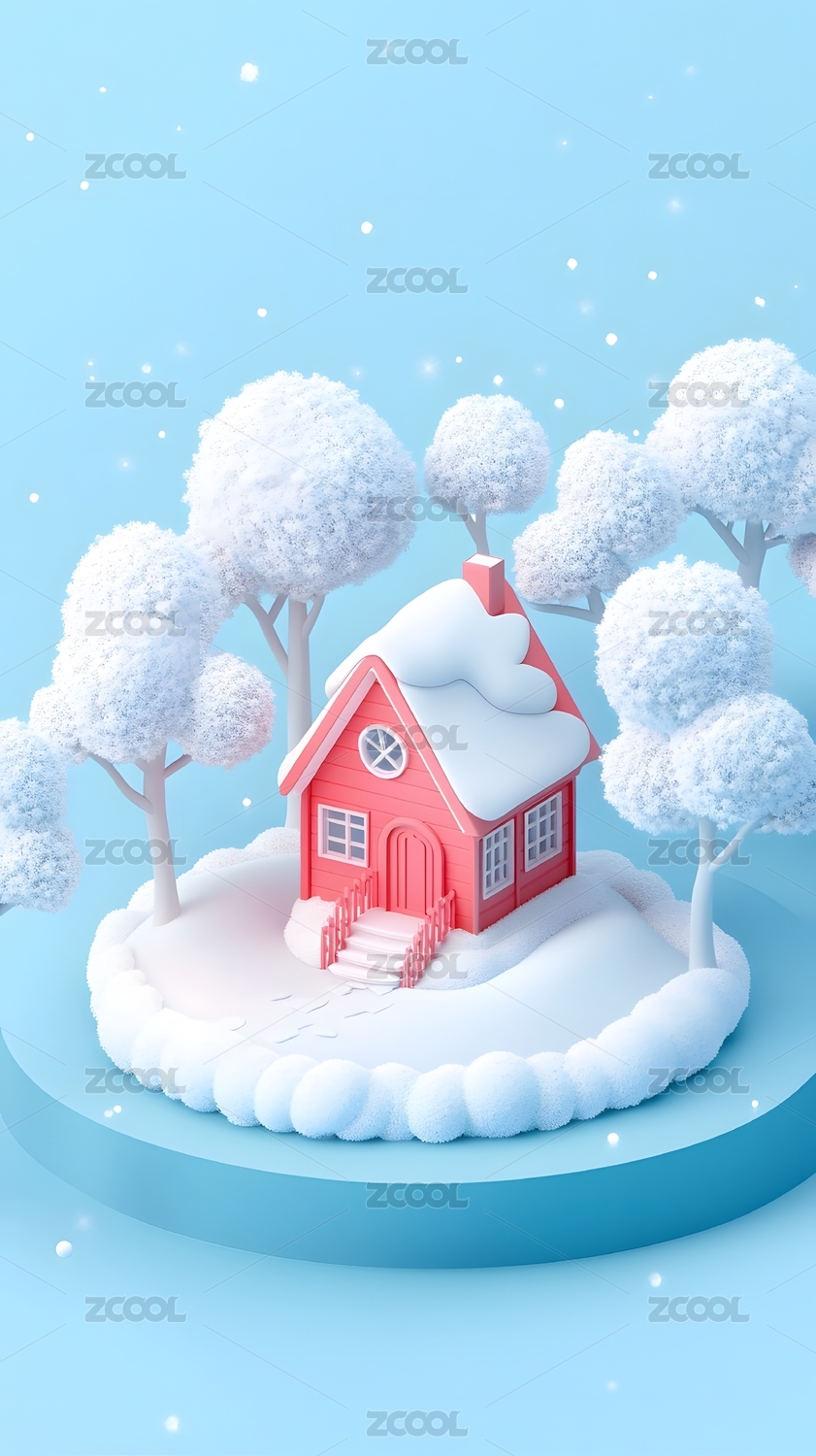 冬天白天有雪山坡上的木屋3D卡通立体插画