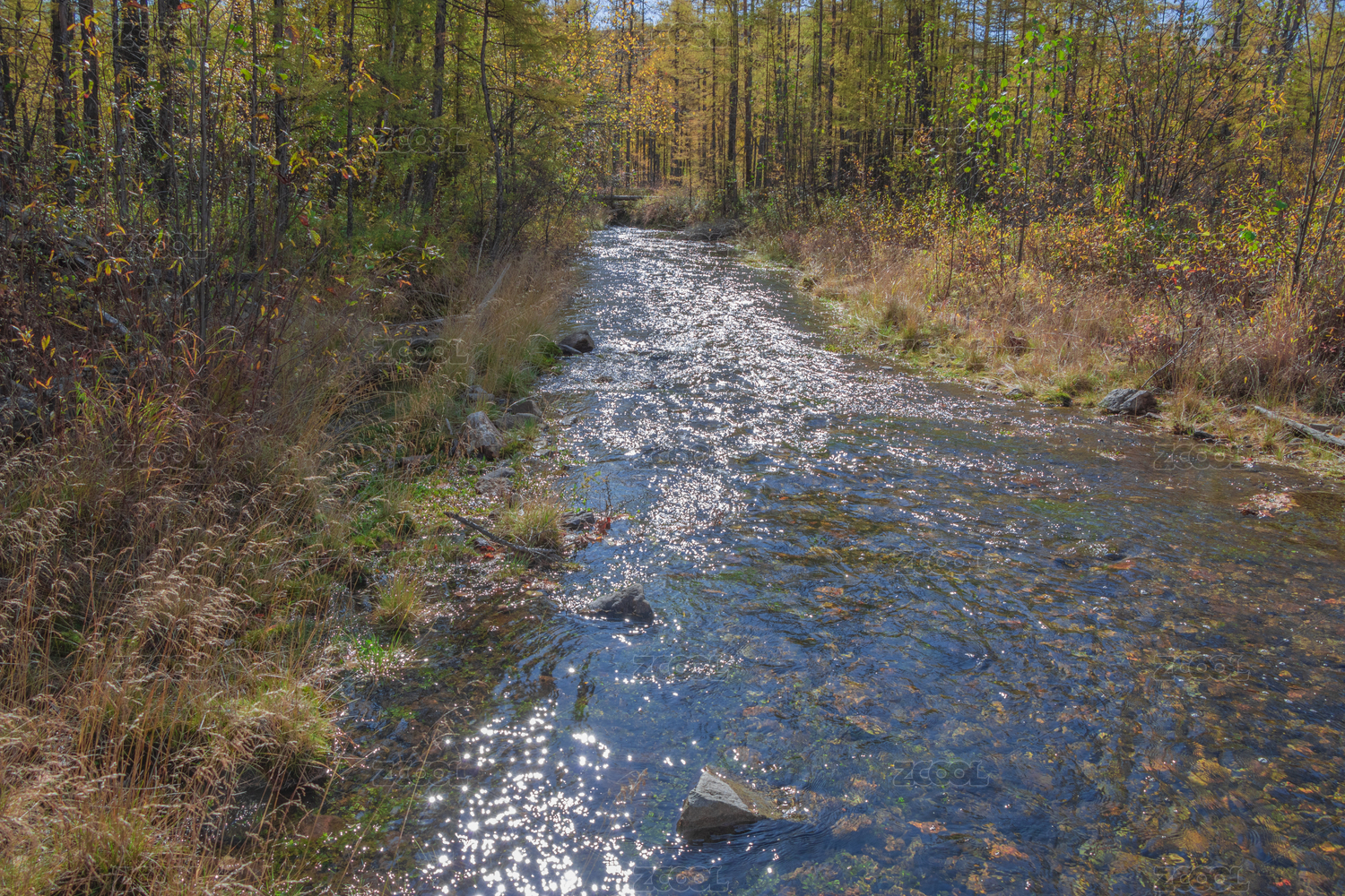 中国大兴安岭秋天森林中的小河