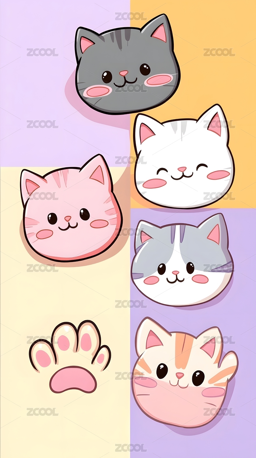 可爱多色猫咪头像与猫爪插画