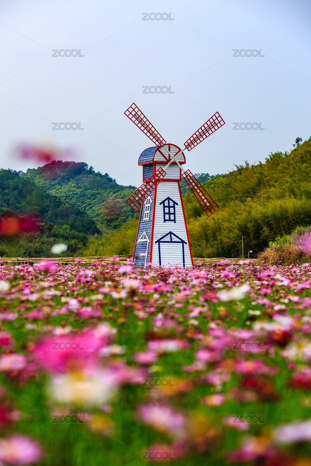 浙江杭州富阳铜鉴湖公园秋天茅草亭与波斯菊