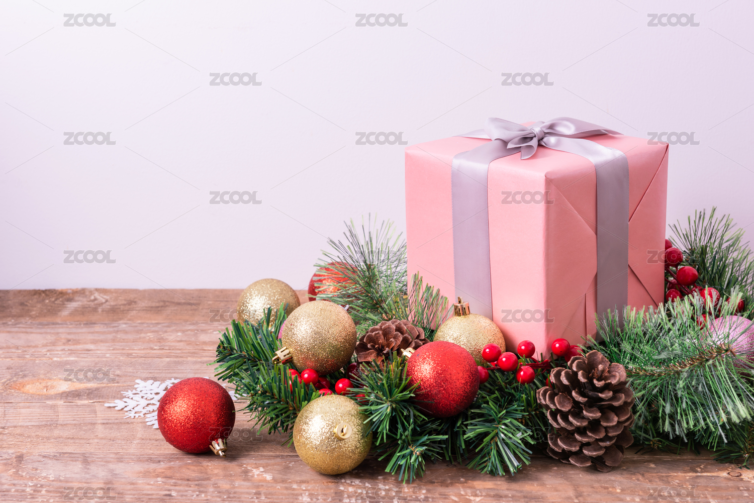 圣诞礼盒和圣诞节装饰品在桌子上,圣诞节节日礼物背景,粉色的礼盒和圣诞树,圣诞球,松果在桌子上