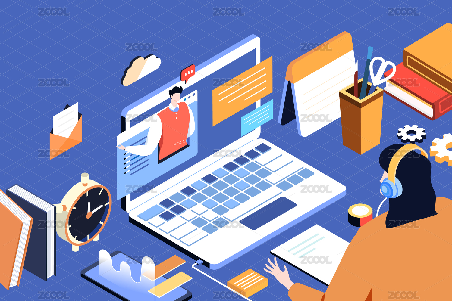 等距网课学生矢量插画