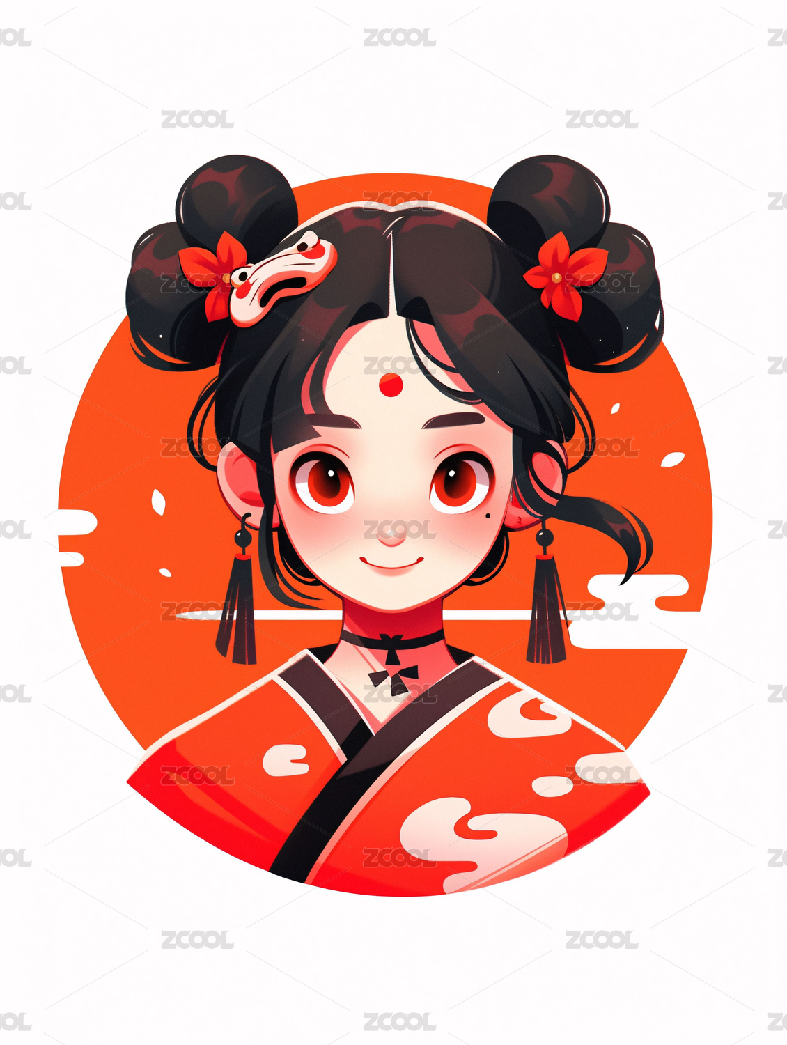 手绘卡通可爱的穿着红色唐装的女孩插画