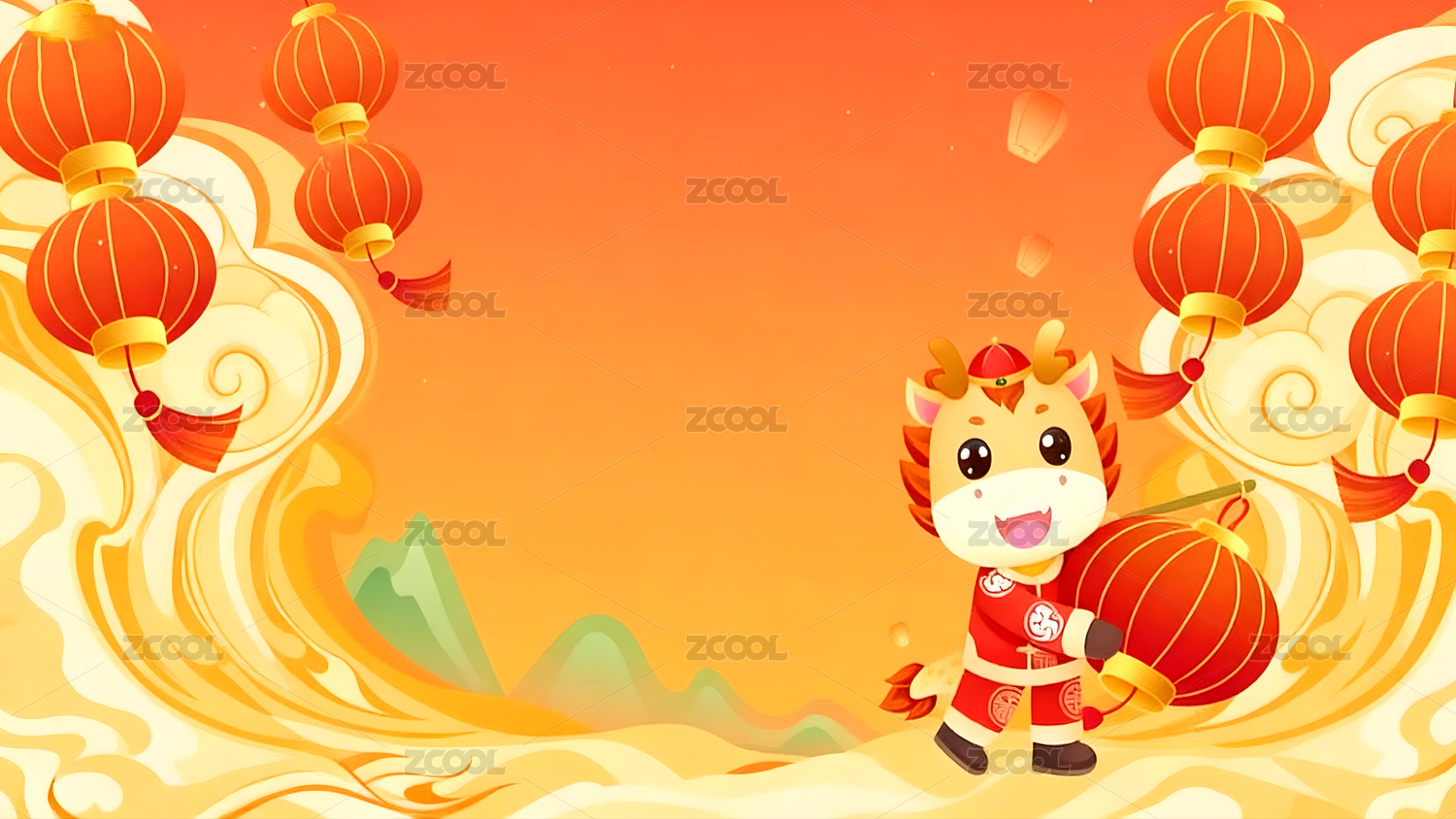 国潮风新年一只龙在舞狮和灯笼窗帘背景