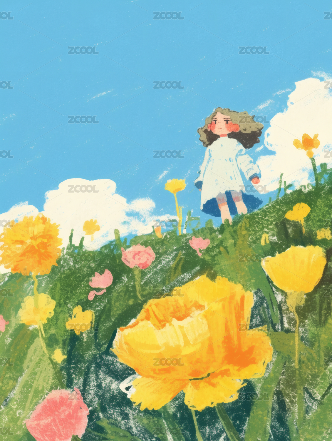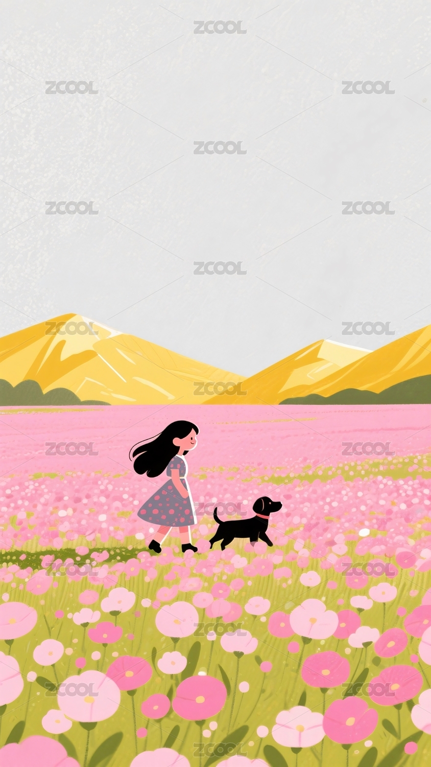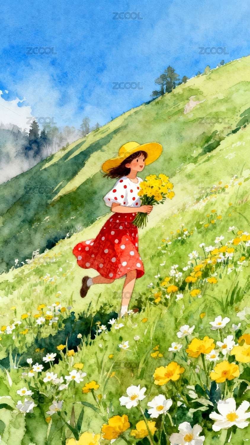 大波斯菊盛开的山坡和穿黄裙子的女孩