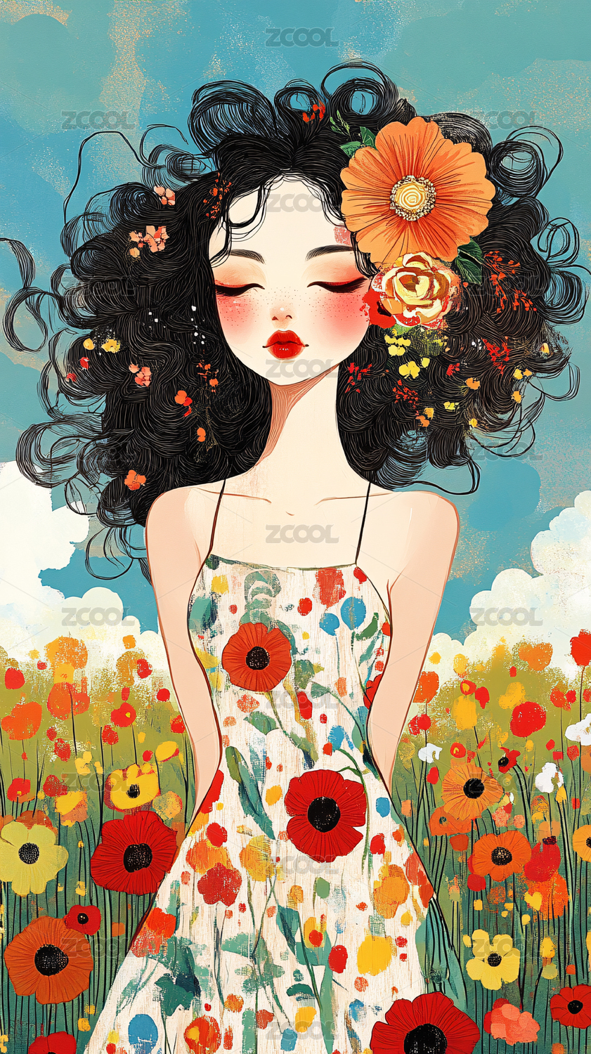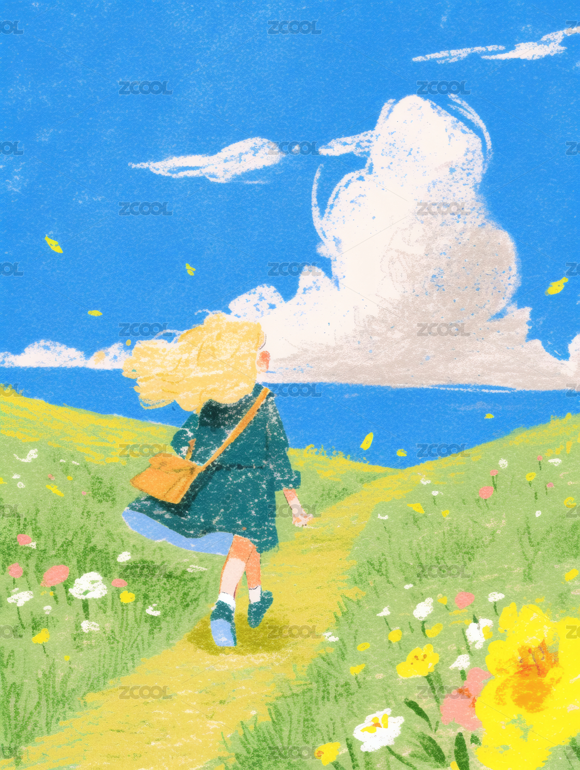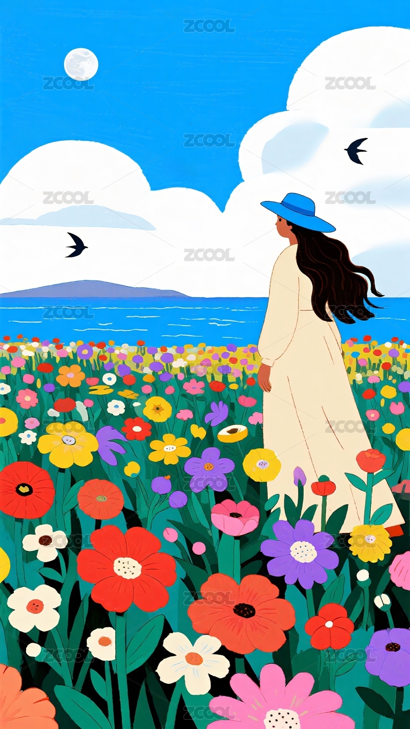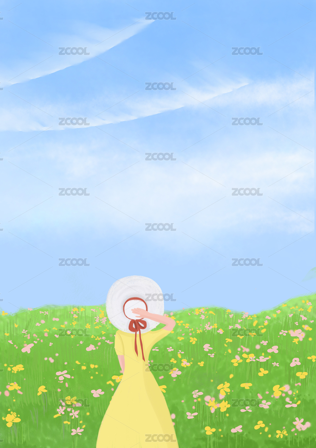 大波斯菊盛开的山坡和穿黄裙子的女孩