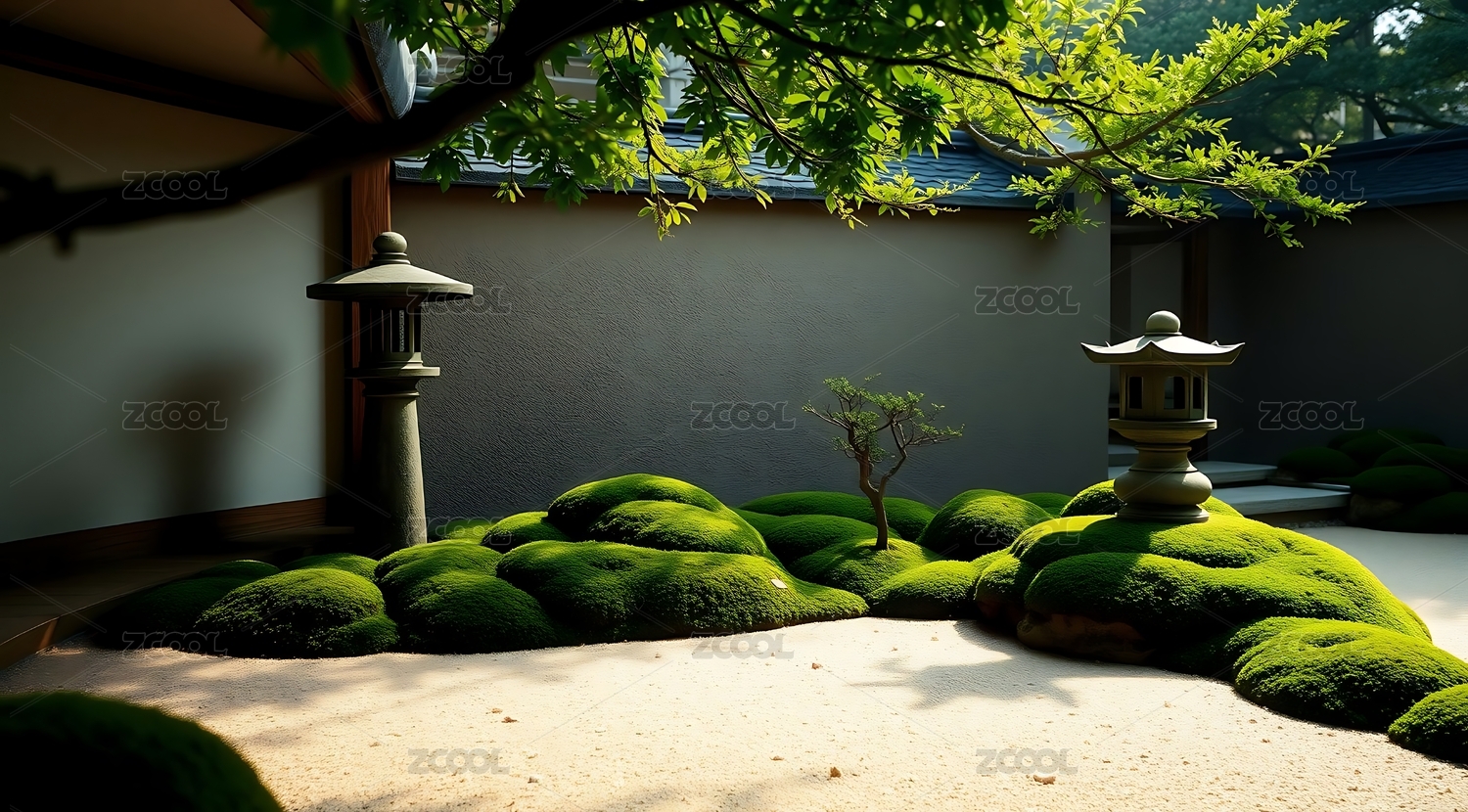 日式禅意庭院石灯与苔藓相映成趣