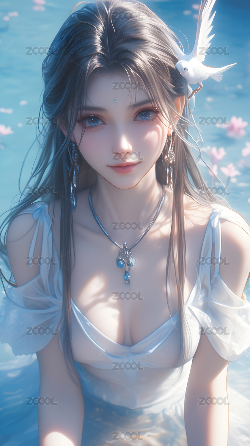清澈水池中的白衣女子