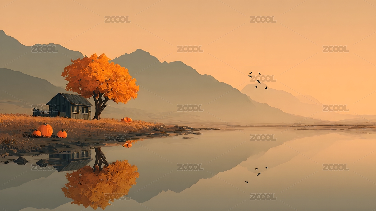 风景,自然,梦幻,宁静,插画,壁纸,背景,树木,小屋,天空