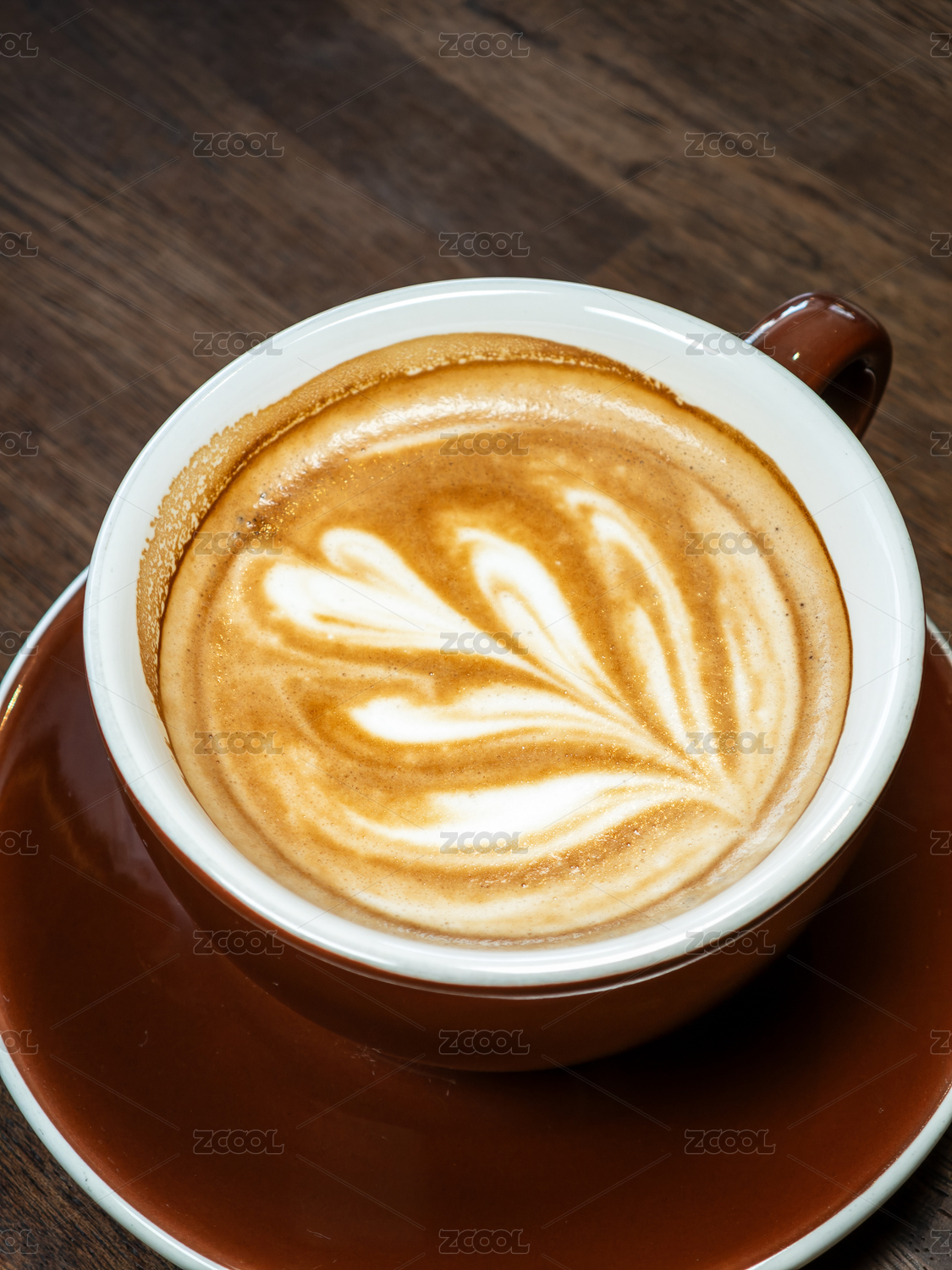 咖啡馆木桌上带有树叶拉花图案的咖啡